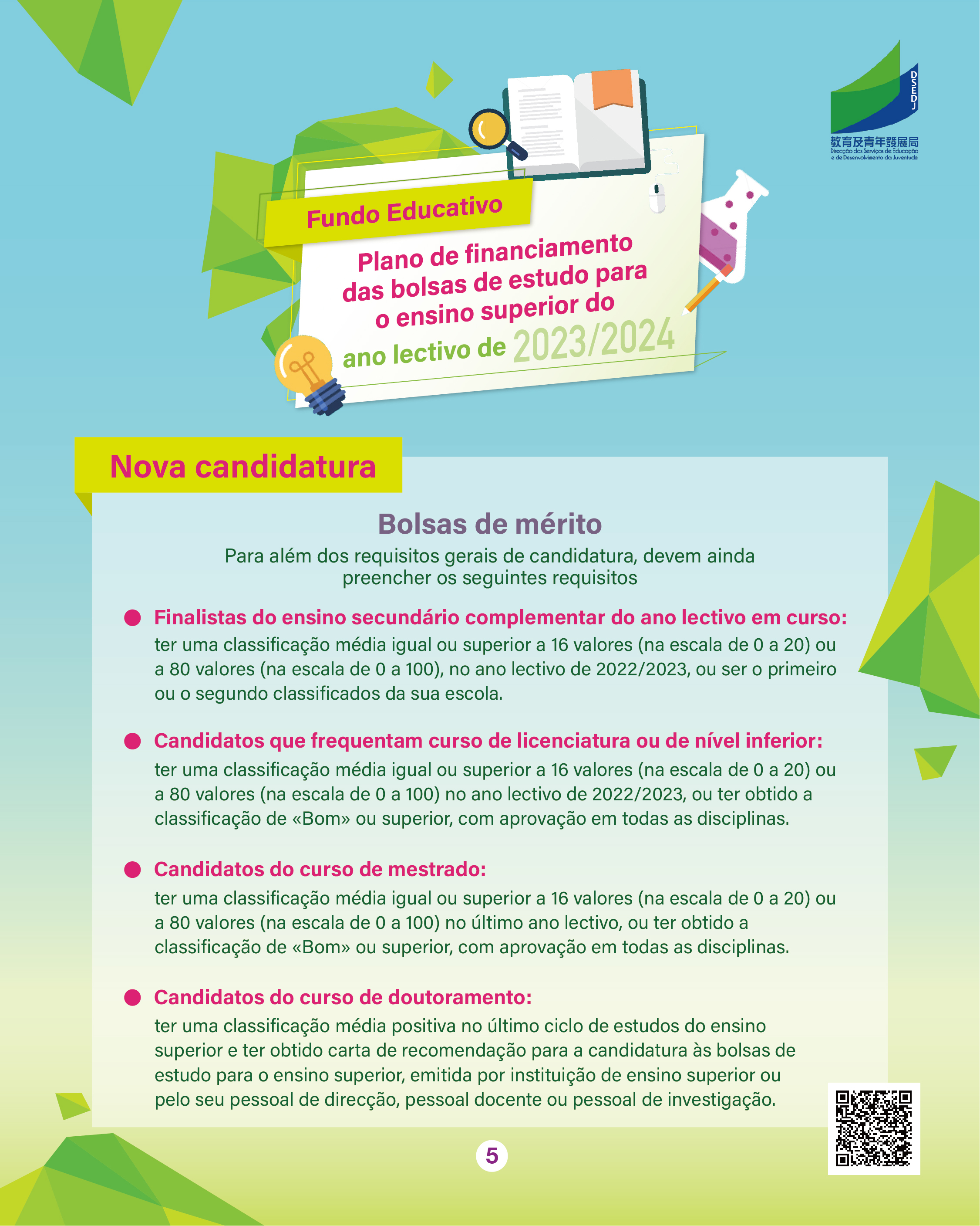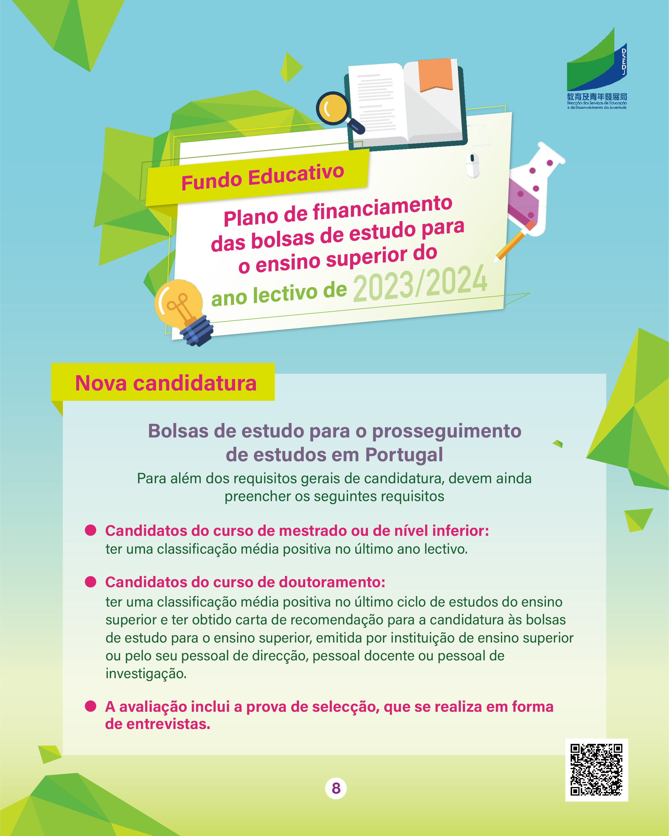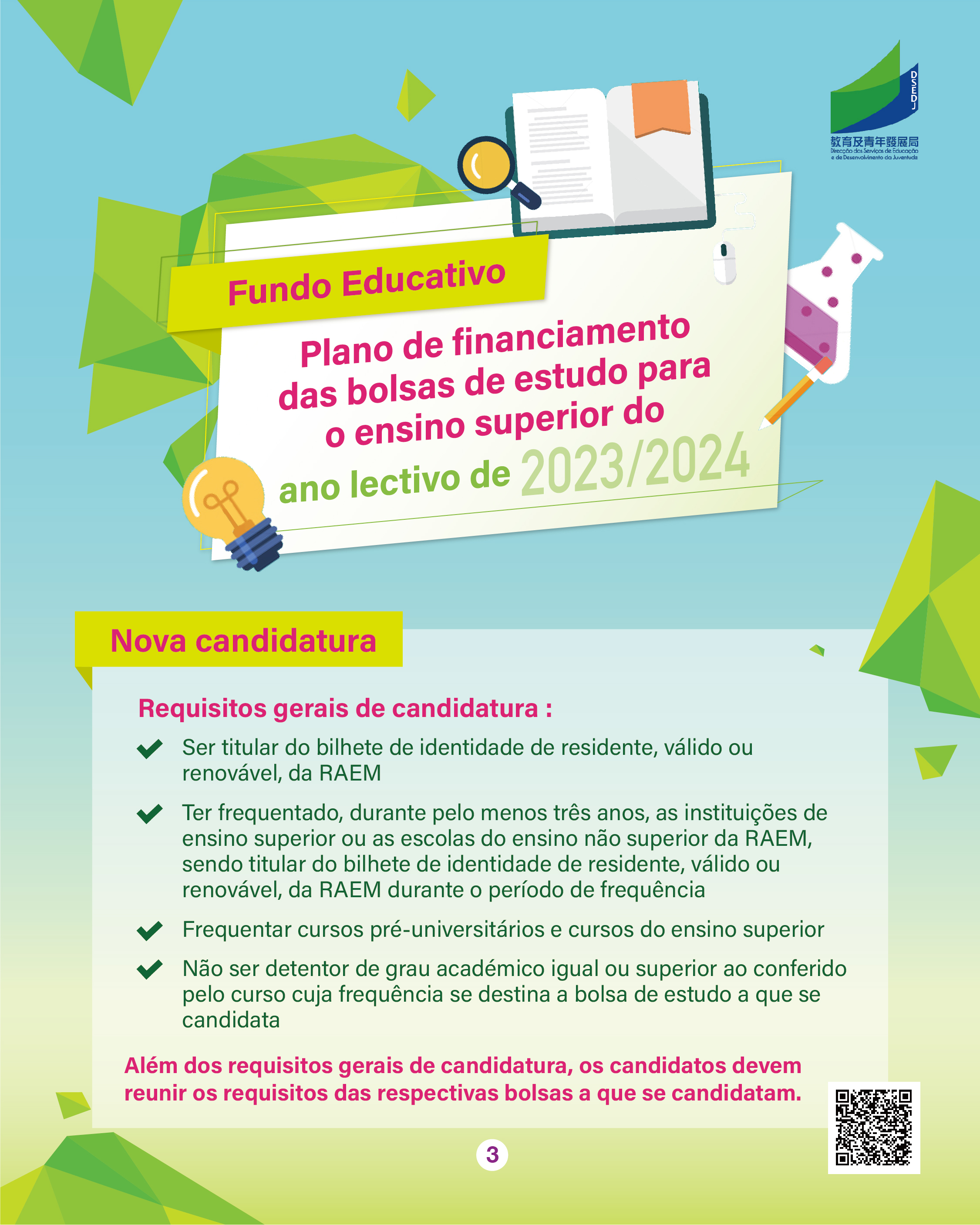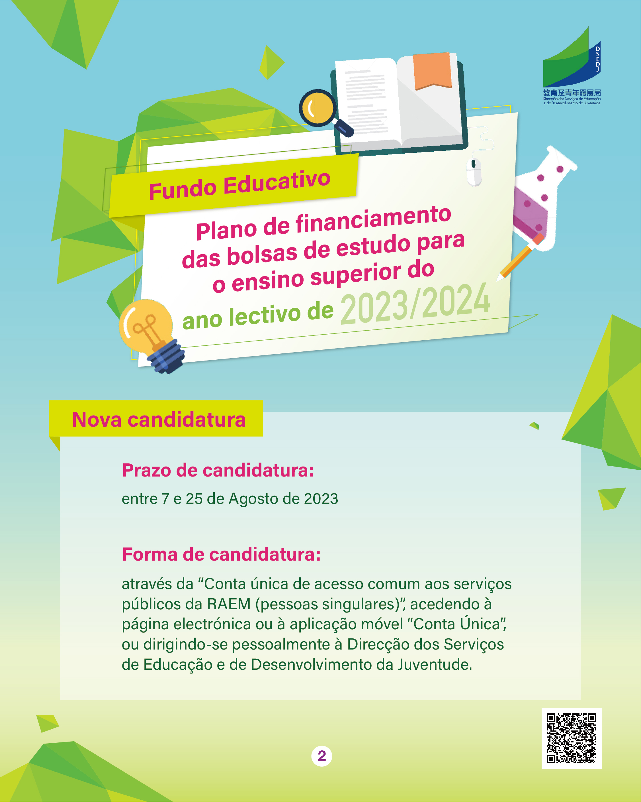 O prazo de candidatura do ano lectivo de 2023/2024 para o “Plano das Bolsas de Estudo para o Ensino Superior” do Fundo Educativo, doravante designado por “Plano”, decorre entre 7 a 25 de Agosto de 2023.