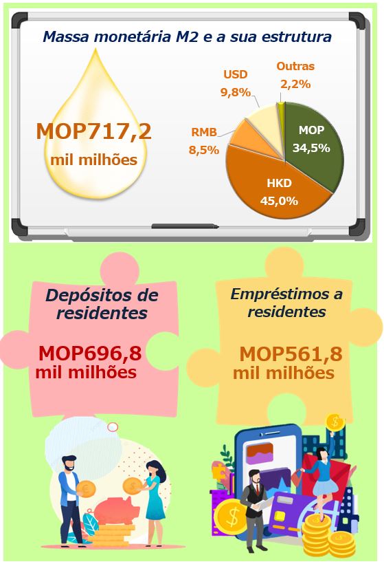 Os depósitos de residentes cresceram 0,6% em comparação com o mês anterior, tendo atingido MOP696,8 mil milhões. Os depósitos de não-residentes cresceram 5,9%, tendo atingido MOP294,1 mil milhões. Por enquanto, os depósitos do sector público na actividade bancária cresceram para MOP221,1 mil milhões, representando um crescimento de 0,3%. Como resultado, o total dos depósitos da actividade bancária registou um crescimento de 1,8% quando comparado com o mês anterior, tendo atingido MOP1.212,1 mil milhões. A proporção da MOP, dos HKD, dos RMB e dos USD nos depósitos foi de 20,5%, 44,8%, 9,7% e 22,4%, respectivamente.