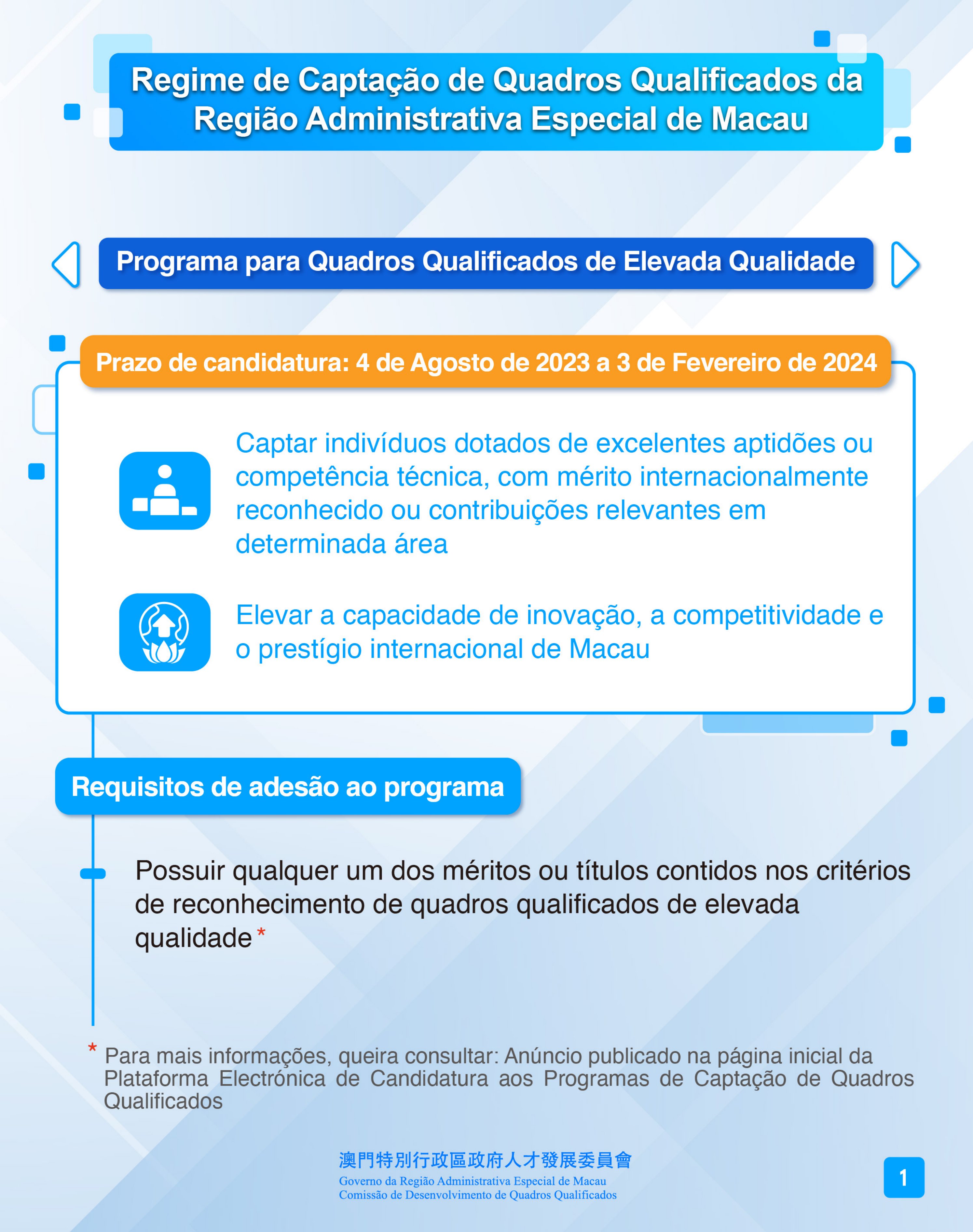 De 4 de Agosto de 2023 a 3 de Fevereiro de 2024, encontra-se aberto o período de candidaturas ao Programa para Quadros Qualificados de Elevada Qualidade, que visa captar indivíduos dotados de excelentes aptidões ou competência técnica, com mérito internacionalmente reconhecido ou contribuições relevantes em determinada área, a fim de elevar a capacidade de inovação, a competitividade e o prestígio internacional da RAEM. Os candidatos têm de possuir qualquer um dos méritos ou títulos constantes dos critérios de reconhecimento de quadros qualificados de elevada qualidade aplicáveis ao programa.