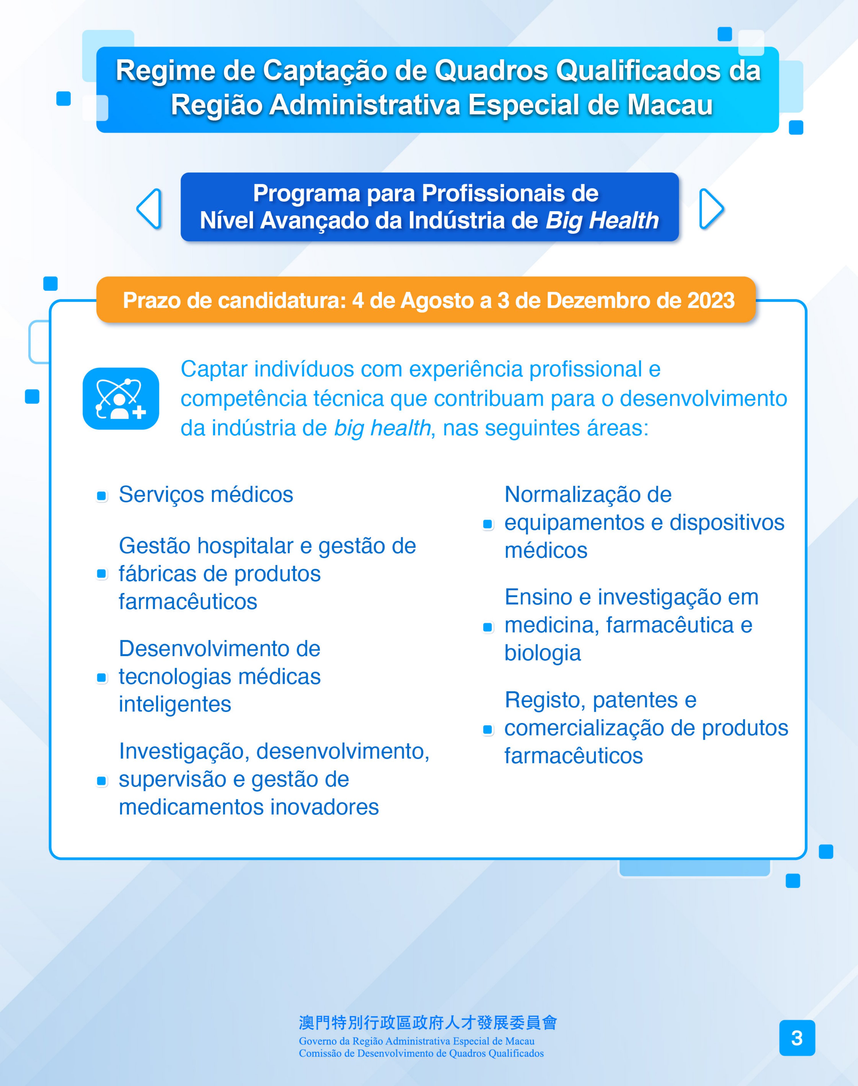 De 4 de Agosto a 3 de Dezembro de 2023, encontra-se aberto o período de candidaturas ao Programa para Profissionais de Nível Avançado da Indústria de Big Health, que visa captar indivíduos com experiência profissional e competência técnica que contribuam para o desenvolvimento da indústria de big health, nas seguintes áreas profissionais: 1) serviços médicos; 2) gestão hospitalar e gestão de fábricas de produtos farmacêuticos; 3) desenvolvimento de tecnologias médicas inteligentes; 4) investigação, desenvolvimento, supervisão e gestão de medicamentos inovadores; 5) normalização de equipamentos e dispositivos médicos; 6) ensino e investigação em medicina, farmacêutica e biologia; 7) registo, patentes e comercialização de produtos farmacêuticos. Os candidatos têm de preencher, cumulativamente, os seguintes requisitos: possuir licenciatura ou grau superior em medicina, em farmácia, em saúde pública, em gestão administrativa hospitalar, em ciências da vida ou afins, e experiência profissional não inferior a dois anos nas áreas profissionais acima referidas, ou possuir licenciatura ou grau superior noutras disciplinas e experiência profissional não inferior a quatro anos nas áreas profissionais acima referidas; ter completado 21 anos de idade; possuir boa capacidade de expressão em qualquer das línguas chinesa, portuguesa ou inglesa; obter 150 valores na pontuação máxima de 300 valores, atribuídos de acordo com o mapa de pontuação aplicável ao programa; ser contratado ou ser prometida a contratação por empregador local, no prazo de 90 dias a contar da data de produção de efeitos da decisão da autorização de residência, para o desempenho de funções especializadas que correspondem às profissões com escassez de recursos humanos definidas no programa, sendo exigido, para o efeito, o nível remuneratório de, pelo menos, 600 000 patacas por ano.