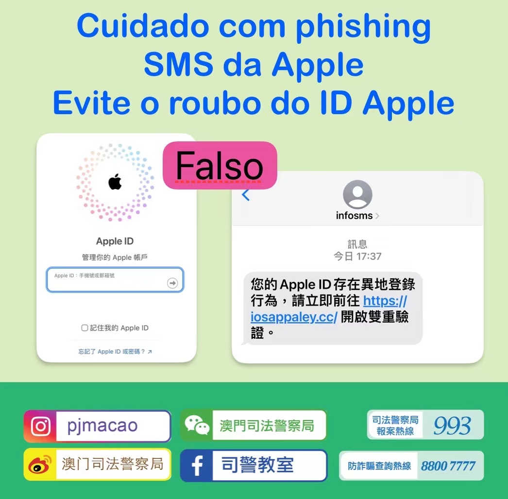 A Polícia Judiciária (PJ) descobriu recentemente que os criminosos têm vindo enviar mensagem de texto SMS com links de fonte desconhecida, simulando serem a empresa da Apple. As mensagens informam que foi feito log in na identidade de acesso, ID Apple, da vítima numa outra região pelo que é necessário fazer autenticação de dois factores, e pedem para se clicar no link indicado nessa mensagem.