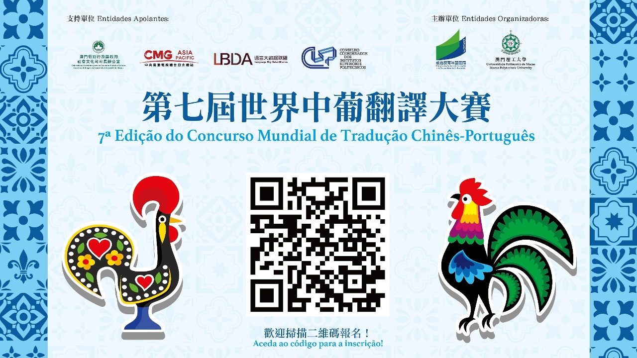 Em consonância com a construção do País e da Grande Baía Guangdong-Hong Kong-Macau e com o propósito de promover o intercâmbio e a cooperação amistosa entre a China e os Países de Língua Portuguesa, com o apoio do Gabinete da Secretária para os Assuntos Sociais e Cultura do Governo da Região Administrativa Especial de Macau (GSASC), da representação da estação Ásia-Pacífico do China Media Group (CMG), da Language Big Data Alliance (LBDA), e do Conselho Coordenador dos Institutos Superiores Politécnicos (CCISP), a Direcção dos Serviços de Educação e de Desenvolvimento da Juventude do Governo da Região Administrativa Especial de Macau (RAEM) e a Universidade Politécnica de Macau co-organizam a 7.ª edição do Concurso Mundial de Tradução Chinês-Português, cujas inscrições terminam a 25 de Agosto. Sendo bem-vinda a participação de todos!