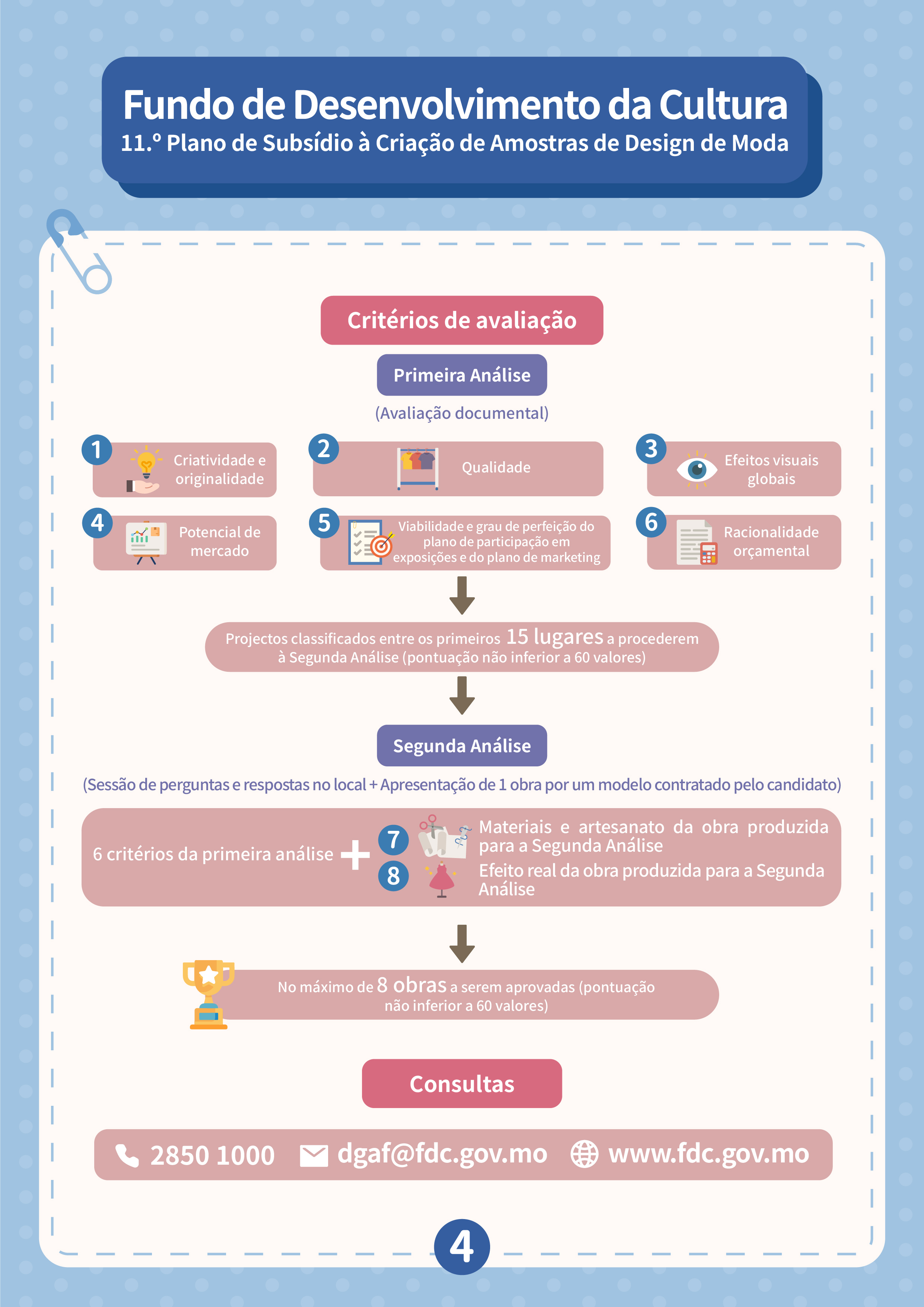 De 8 de Setembro a 16 de Outubro, serão aceites candidaturas ao “11.º Plano de subsídio à criação de amostras de design de moda”, com vista a incentivar a investigação e desenvolvimento inovadores do design de moda local, impulsionar os designers a definir planos de marketing viáveis e promover o desenvolvimento de actividades comerciais ou a participação em exposições de moda de Macau e do exterior, aumentando assim a sua visibilidade e competitividade nos mercados. Os candidatos podem apresentar candidatura a título individual ou em grupo, cujo número mínimo de obras candidatas é de 8 modelos. Os projectos financiados devem participar, pelo menos, uma vez nas actividades de moda durante o prazo de apoio financeiro. O processo de avaliação é composto pela Primeira Análise (avaliação documental) e Segunda Análise (sessão de perguntas e respostas no local). Os candidatos que procederão à Segunda Análise devem escolher um modelo para apresentar uma amostra de moda no local, sendo a quota máxima de subsídio de 8.
