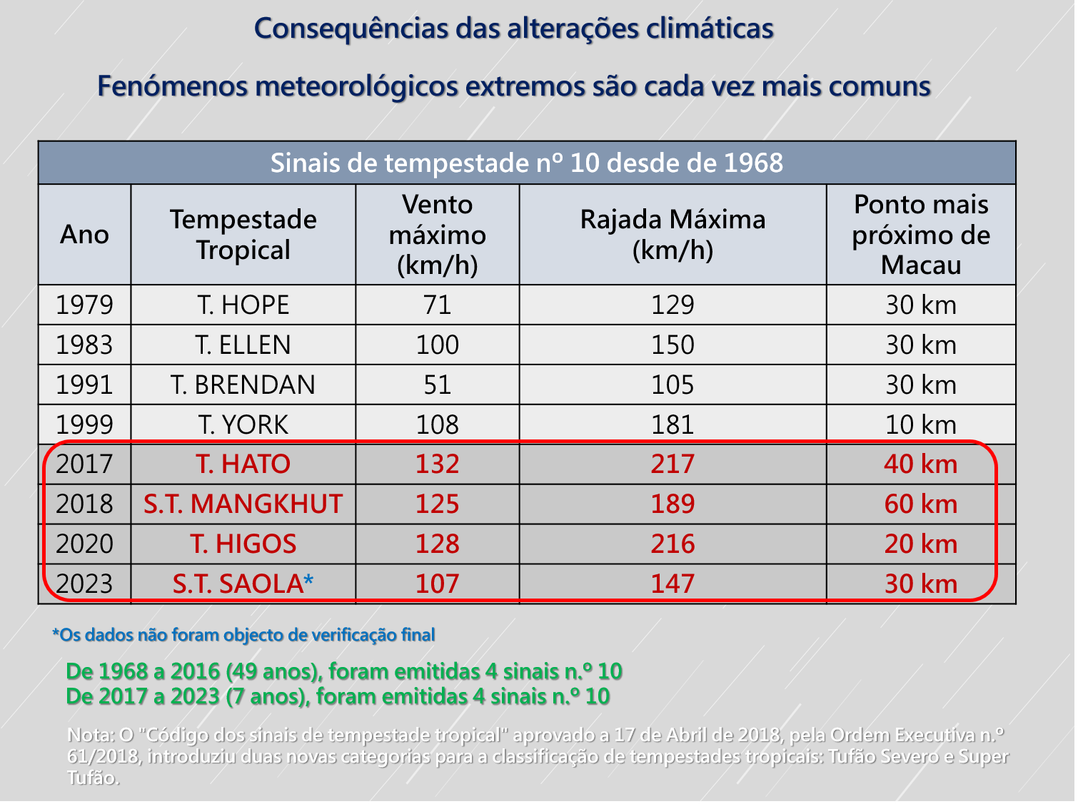 As alterações climáticas levam a condições meteorológicas extremamente severas mais frequentes. Após a passagem do tufão “Hato” em 2017, do tufão “Mangkhut” em 2018 e do tufão “Higos” em 2020, o sinal n.º 10 de tempestade tropical de "Saola" foi emitido pela quarta vez em sete anos. Em comparação com o sinal n.º 10 emitido entre 1968 e 2016 (49 anos no total). Nos últimos anos, registou-se um aumento significativo da frequência de emissão. (Figura 7)