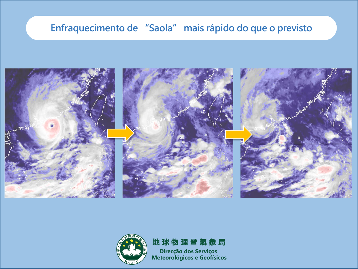 O tufão "Saola" foi o primeiro sinal n.o 10 de tempestade tropical para Macau nos últimos três anos. À medida que "Saola" se afasta e enfraquece, gradualmente, esta Direcção emitiu o sinal n. o 3 para substituição o sinal n. o 8SE pelas 15:00 horas de hoje (dia 2).