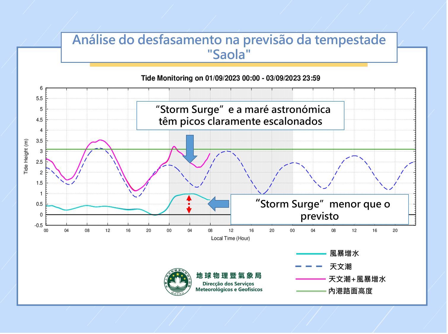 De acordo com as informações dos diversos modelos, previa-se que o “Saola” iria trazer a Macau e até à zona do Estuário do Rio das Pérolas um “Storm Surge” mais significativo (Figura 3). Tendo em consideração os riscos de prevenção de desastres meteorológicos, esta Direcção emitiu o Aviso de “Storm Surge” - Vermelho.