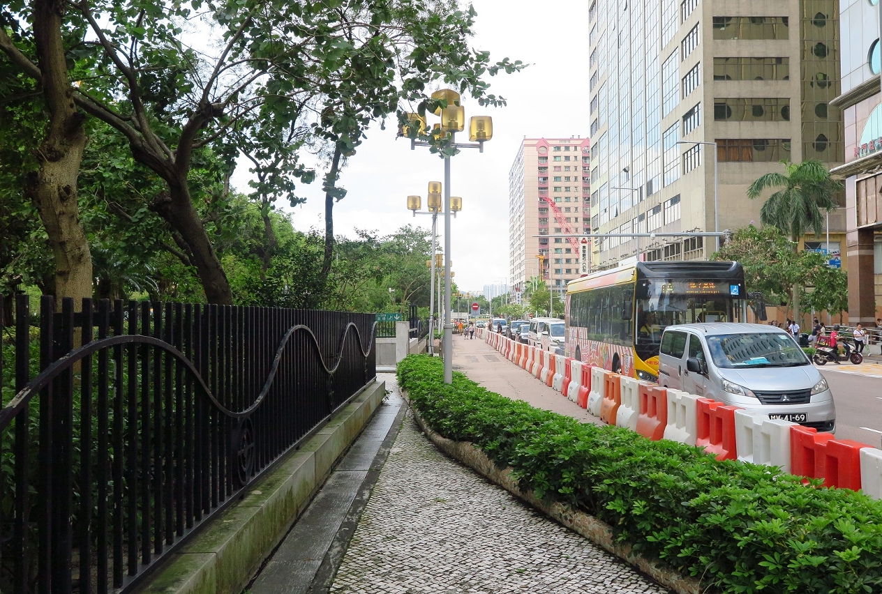 O passeio em redor do Parque é estreito em certas partes, os peões necessitam de contornar o passeio exterior do Parque para atravessar a rua, e os quatro acessos de entrada e saída do auto-silo subterrâneo do Parque ocupam parte do passeio exterior. Tudo isto não favorece a circulação de peões a longo prazo. Por outro lado, a diferença de nível no acesso ao Parque também dificulta a entrada e saída de cadeiras de rodas. A obra irá optimizar e manter o passeio no exterior do Parque, melhorando as linhas dinâmicas de circulação pedonal e a sua acessibilidade, para que os cidadãos possam atravessar a via cruzando directamente o Parque, no sentido de encurtar a distância percorrida pelos peões. As vedações metálicas periféricas do Parque serão removidas, eliminando a sensação de isolamento, e alargando a amplitude de visão do Parque. Os trabalhos irão também aperfeiçoar o ambiente de circulação livre de barreiras no passeio exterior do Parque. Em simultâneo, serão acrescentadas faixas verdes no passeio, enriquecendo os elementos verdes do Parque, embelezando a paisagem, e contribuindo também para a separação entre veículos e pessoas.