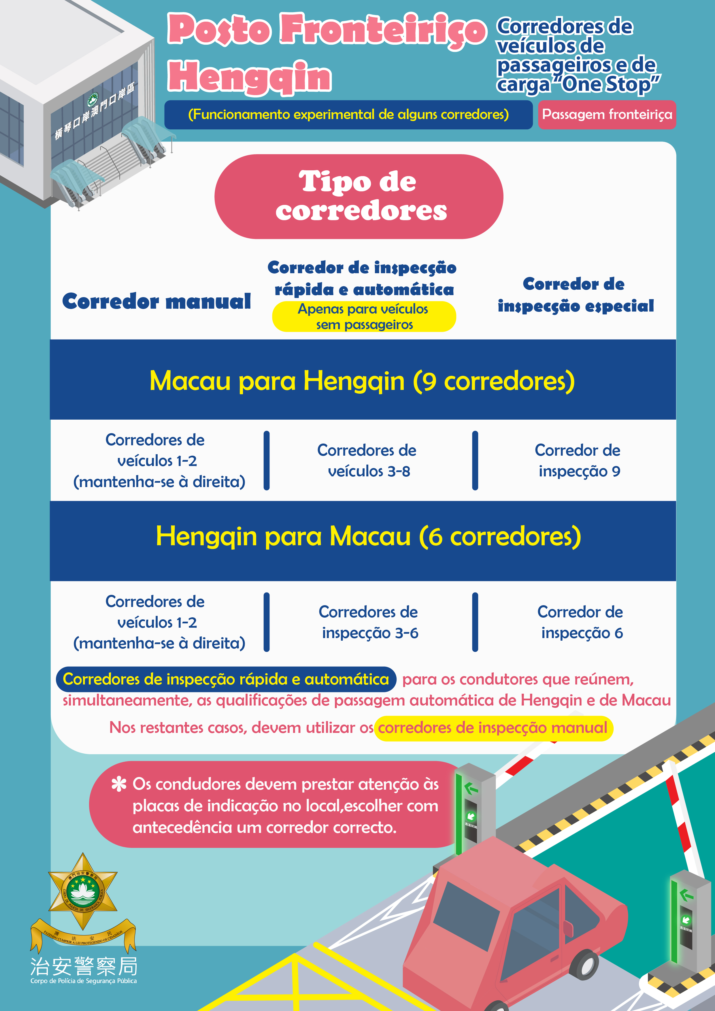 Os veículos com dupla matrícula de Guangdong e Macau qualificados para circular no Posto Fronteiriço Hengqin e os veículos de matrícula única de Macau autorizados a entrar e sair de Hengqin podem utilizar os corredores de inspecção rápida e automática ou os corredores de inspecção manual para a passagem fronteiriça. Os corredores de inspecção rápida e automática destinam-se apenas aos veículos sem passageiros, e o seu condutor deve, simultaneamente, reunir os requisitos para a passagem fronteiriça rápida e automática das duas regiões, Hengqin e Macau; os veículos que transportam passageiros, ou, os condutores que não reúnem os requisitos de passagem fronteiriça rápida e automática, devem usar os corredores de inspecção manual.