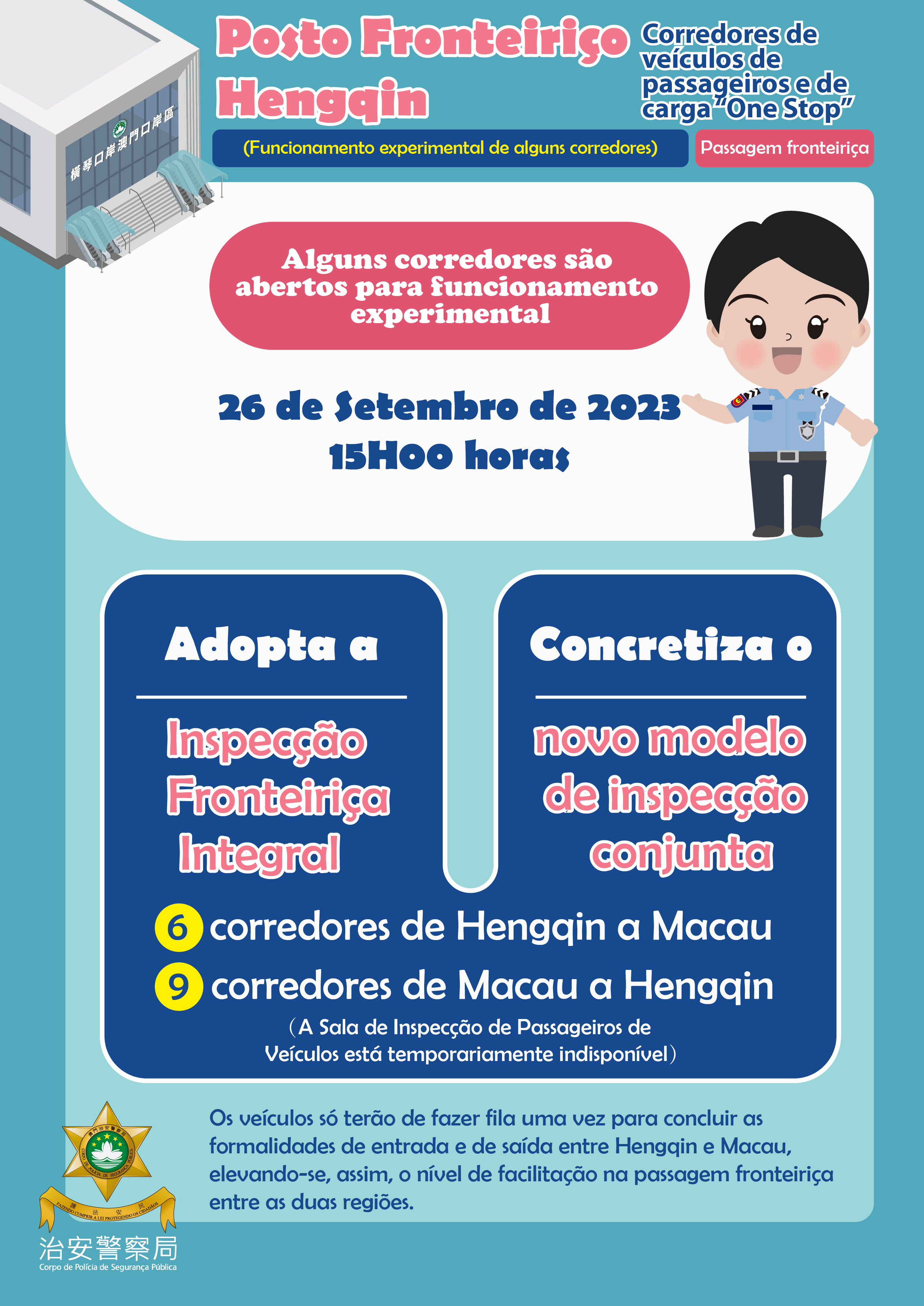 De acordo com o planeamento geral da 2.ª fase da obra de construção do projecto do Posto Fronteiriço de Hengqin, foi concluída a construção de alguns corredores de inspecção “One-Stop” para passagem de veículos de passageiros e de carga (6 corredores na direcção de Hengqin para Macau e 9 corredores de Macau para Hengqin). Após negociações, e de se ter alcançado um consenso entre os serviços de Hengqin e de Macau, está previsto para as 15:00 horas do dia 26 de Setembro de 2023 o início do funcionamento experimental. Em simultâneo, será aberto o corredor para veículos na ponte de acesso que liga a Universidade de Macau e o Posto Fronteiriço de Hengqin e será totalmente reaberta a Ponte Flor de Lótus.