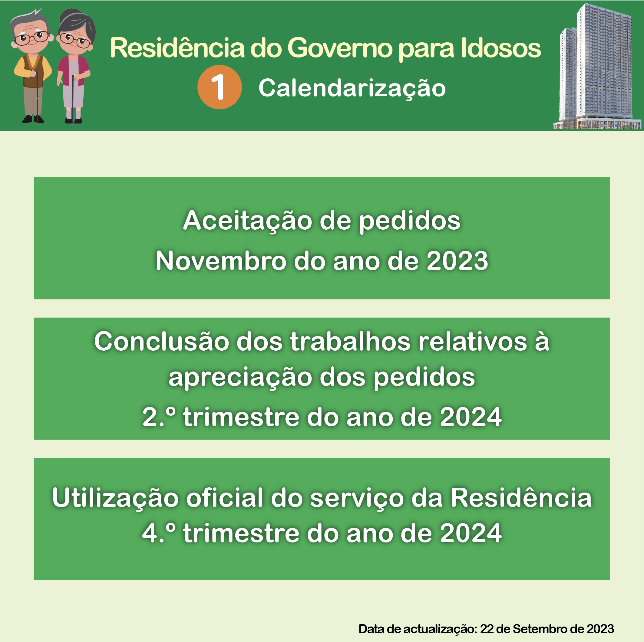 Através do Regulamento Administrativo, intitulado “Regulamento de utilização e gestão da Residência do Governo para Idosos”, irá ser publicado o conteúdo concreto, nomeadamente, relativo aos requisitos para a candidatura à Residência do Governo para Idosos, adiante designada por Residência, procedimentos e classificação. O Instituto de Acção Social (IAS) prevê o início da aceitação de candidaturas à utilização da Residência em Novembro, a conclusão do trabalho de apreciação e aprovação das candidaturas à Residência no 2.º trimestre de 2024, a conclusão das obras de remodelação e da montagem da Residência no 3.º trimestre e a utilização da Residência pelos idosos habilitados no 4.º trimestre.