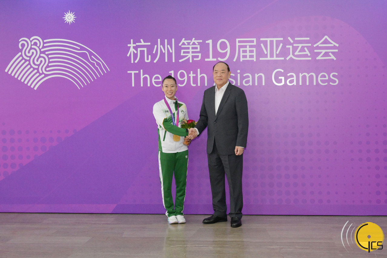 Li Yi conquistou a primeira medalha de ouro e honra para a Região Administrativa Especial de Macau (RAEM) nesta edição dos Jogos Asiáticos. Depois de assistir à cerimónia de entrega de prémios, o Chefe do Executivo felicitou Li Yi, tirou uma fotografia de grupo, bem como agradeceu à atleta e à equipa de treinadores pela dedicação ao longo do tempo. Também teve lugar uma fotografia de grupo para marcar o alegre momento, com a presença do Chefe do Executivo, Li Yi, Song Chi Kuan, que conquistou ontem a medalha de bronze na modalidade masculina de Chang Quan, e os outros atletas e treinadores de Macau que participam nesta edição dos Jogos Asiáticos, a fim de partilhar com toda a população de Macau a alegria e honra dos bons resultados obtidos. O mesmo responsável incentivou ainda outros atletas de artes marciais de Macau a continuarem a desempenhar o seu melhor, a vencerem mais campeonatos com esforço e coragem e a trazerem honras a Macau.