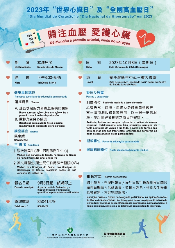 Em resposta ao “Dia Mundial do Coração” e ao “Dia Nacional da Hipertensão”, os Serviços de Saúde, em colaboração com a Comissão para a Cidade Saudável e a Comissão de Prevenção e Controlo das Doenças Crónicas, e com a colaboração da Associação dos Artistas de Belas-Artes de Macau, organizaram o Concurso de Desenho de “Proteja o Coração Saudável”; No dia 8 de Outubro, em colaboração com a Comissão de Prevenção e Controlo das Doenças Crónicas, realizar-se-á a actividade “Dê atenção à pressão arterial, cuide do coração”, na qual serão organizadas palestras temáticas sobre "A relação entre a pressão emocional e a hipertensão arterial" e "A prática do desporto faz bem à saúde física e mental", foram instalados no local tendas de informação e educação sobre a saúde, uma exposição de pintura intitulada “Proteja o Coração Saudável”, painéis de exposição de conhecimentos sobre saúde, bem como uma série de tendas de medição, tais como, o ritmo cardíaco, lipídios no sangue, a glicemia e o índice da massa corporal, entre outros. Os residentes são bem-vindos a participar pessoalmente nas actividades acima mencionadas. Devido ao número limitado de vagas, os interessados podem inscrever-se através da leitura do código QR, em anexo. Ou clicar no anúncio da actividade “Dê atenção à pressão arterial, cuide do coração” no apps de telemóvel do Jornal Ou Mun ou Jornal Hou Kong para se inscrever.