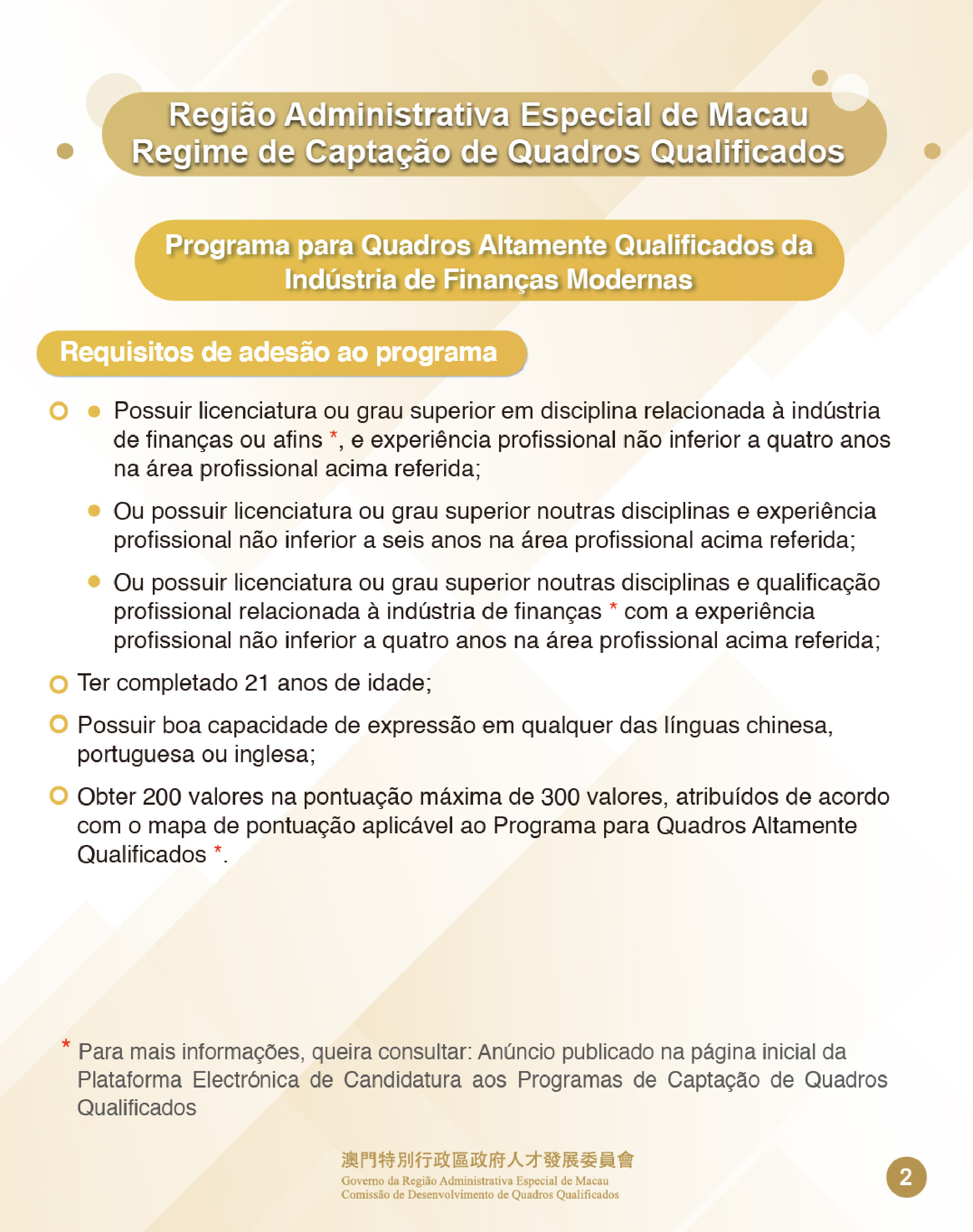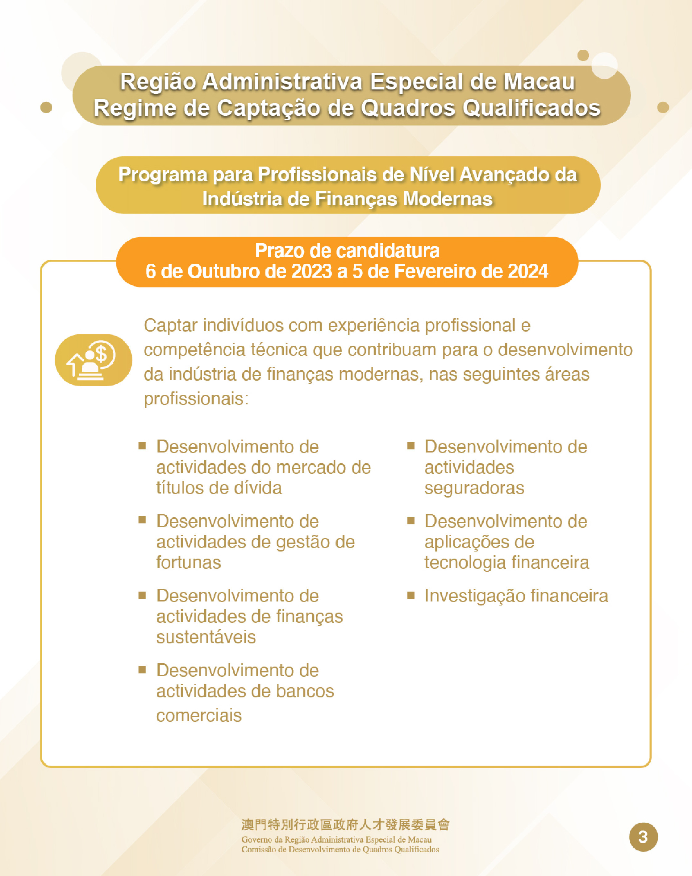 De 6 de Outubro de 2023 a 5 de Fevereiro de 2024, encontra-se aberto o período de candidaturas ao Programa para Quadros Altamente Qualificados da Indústria de Finanças Modernas, que visa captar indivíduos com experiência profissional e competência técnica que contribuam para o desenvolvimento da indústria de finanças modernas, e que possuam excelente desempenho nas seguintes áreas profissionais: 1) Desenvolvimento de actividades do mercado de títulos de dívida; 2) Desenvolvimento de actividades de gestão de fortunas; 3) Desenvolvimento de actividades de finanças sustentáveis; 4) Desenvolvimento de actividades de bancos comerciais; 5) Desenvolvimento de actividades seguradoras; 6) Desenvolvimento de aplicações de tecnologia financeira; 7) Investigação financeira. Os candidatos têm de preencher, cumulativamente, os seguintes requisitos: possuir licenciatura ou grau superior em disciplina relacionada à indústria de finanças ou afins, e experiência profissional não inferior a quatro anos na área profissional acima referida; ou possuir licenciatura ou grau superior noutras disciplinas e experiência profissional não inferior a seis anos na área profissional acima referida; ou possuir licenciatura ou grau superior noutras disciplinas e qualificação profissional relacionada à indústria de finanças com a experiência profissional não inferior a quatro anos na área profissional acima referida; ter completado 21 anos de idade; possuir boa capacidade de expressão em qualquer das línguas chinesa, portuguesa ou inglesa; obter 200 valores na pontuação máxima de 300 valores, atribuídos de acordo com o mapa de pontuação aplicável ao programa.
