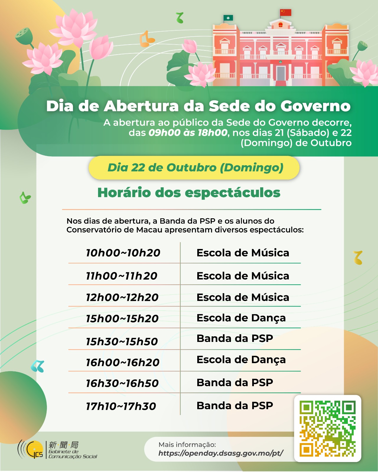 A população pode ainda assistir a uma série de espectáculos, nomeadamente, da Banda da PSP e dos alunos da Escola de Música e Escola de Dança do Conservatório de Macau do Instituto Cultural. A Direcção dos Serviços de Correios e Telecomunicações também terá disponível um posto temporário, no lado oposto à Sede do Governo, no lago Nam Van, onde se poderá pôr o carimbo comemorativo, comprar os produtos filatélicos, no âmbito dos dias da abertura da Sede do Governo.