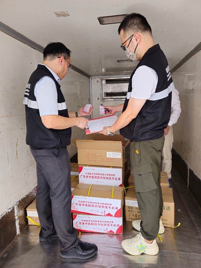 Com o apoio e sob a orientação da Administração Nacional de Produtos Médicos, o Instituto para a Supervisão e Administração Farmacêutica (ISAF) de Macau e a Administração de Medicamentos da Província de Guangdong têm vindo a explorar activamente caminhos de realizar a introdução conveniente dos preparados hospitalares de MTC do Interior da China para utilização em Macau. Recentemente, o ISAF aprovou o pedido do Hospital Kiang Wu de Macau para a transferência transfronteiriça de cinco tipos de preparados hospitalares do Hospital de Medicina Chinesa da Província de Guangdong. O primeiro lote de preparados hospitalares de MTC chegou hoje (dia 25) do Interior da China ao posto fronteiriço de Macau e, após a inspecção e a libertação realizadas pelos inspectores do ISAF, foi recebido pelo Hospital Kiang Wu para aplicação clínica no hospital.