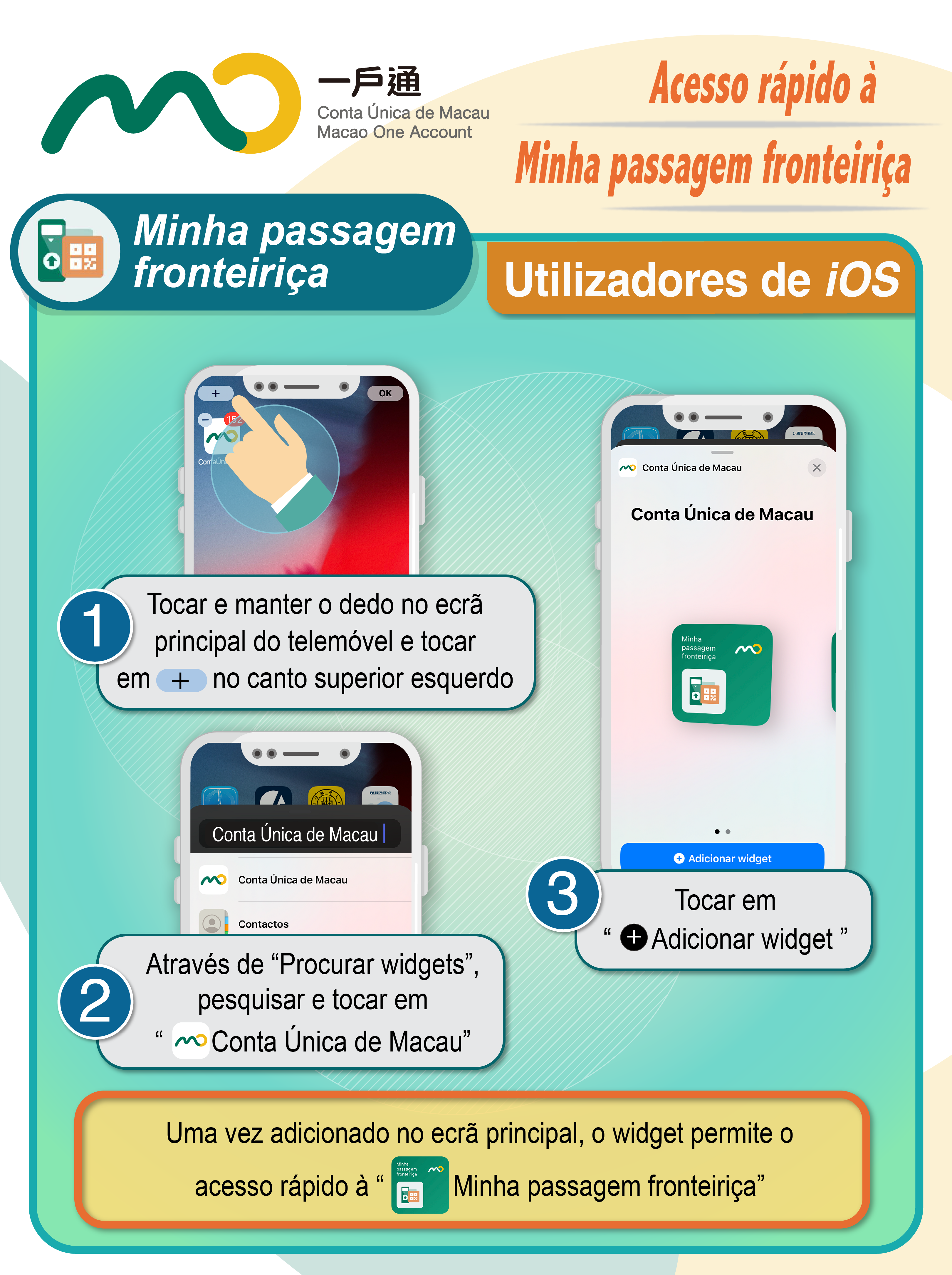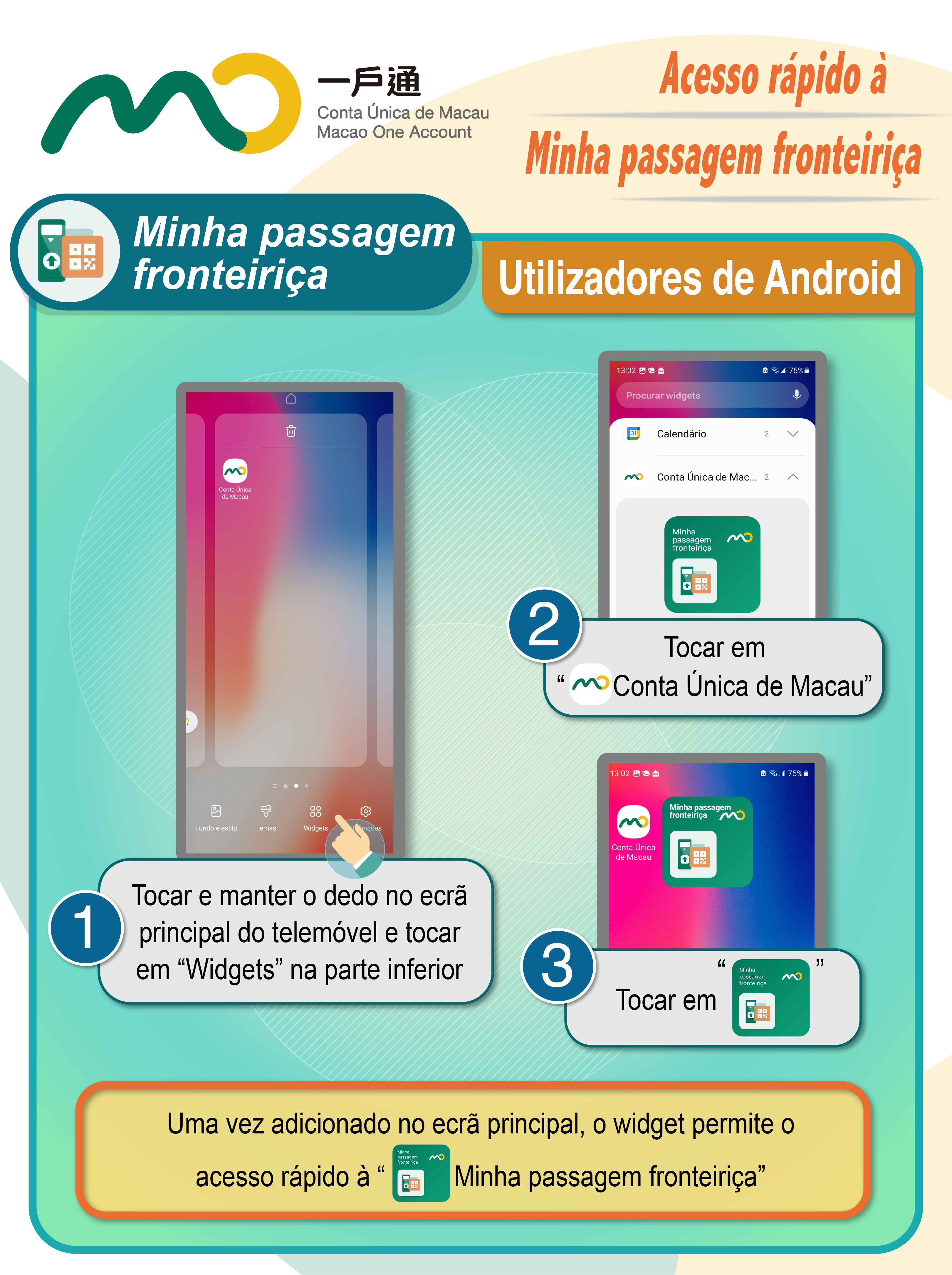 Após a actualização da última versão da Conta Única de Macau, os utilizadores podem adicionar, segundo o tipo de telemóvel, um widget no ecrã principal, através do qual é possível o acesso rápido ao código QR da “Minha passagem fronteiriça” para passar a fronteira, não necessitando de abrir previamente a aplicação móvel da Conta Única de Macau.