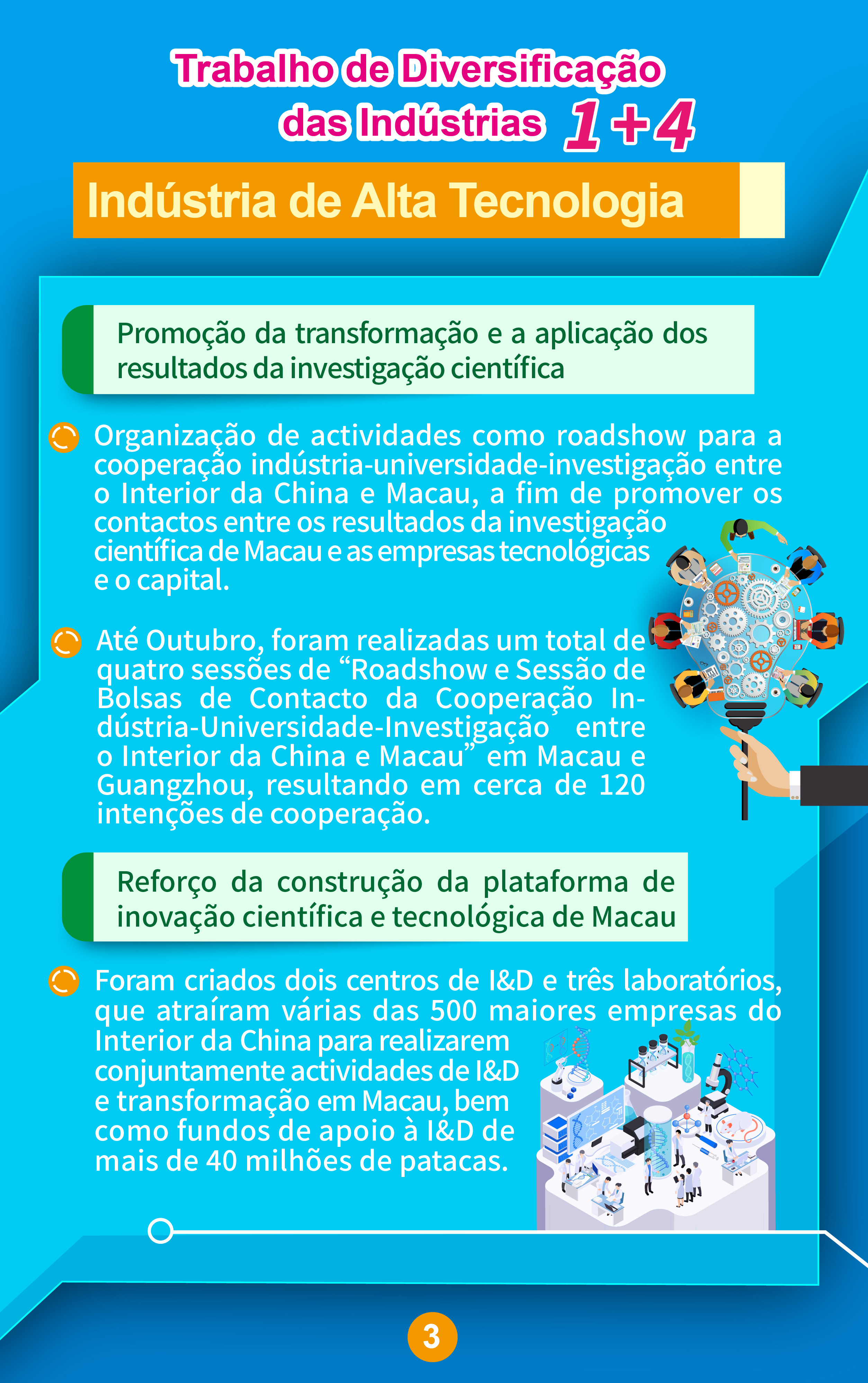 O Governo da RAEM está a impulsionar activamente a estratégia de desenvolvimento da diversificação adequada “1+4”, incluindo as altas e novas tecnologias. Nos últimos anos, o Governo da RAEM tem realizado vários trabalhos na promoção do desenvolvimento da tecnologia, incluindo a promoção da cooperação Indústria-Universidade-Pesquisa entre as empresas e das instituições de investigação científica, promovendo o intercâmbio e cooperação tecnológica com o Interior da China e os Países de Língua Portuguesa, etc. Através do lançamento de diversas políticas e actividades de apoio, o Governo da RAEM tem criado um melhor ambiente político para o desenvolvimento da indústria da tecnologia, promovendo a inovação tecnológica e o desenvolvimento das indústrias de alta e nova tecnologia.