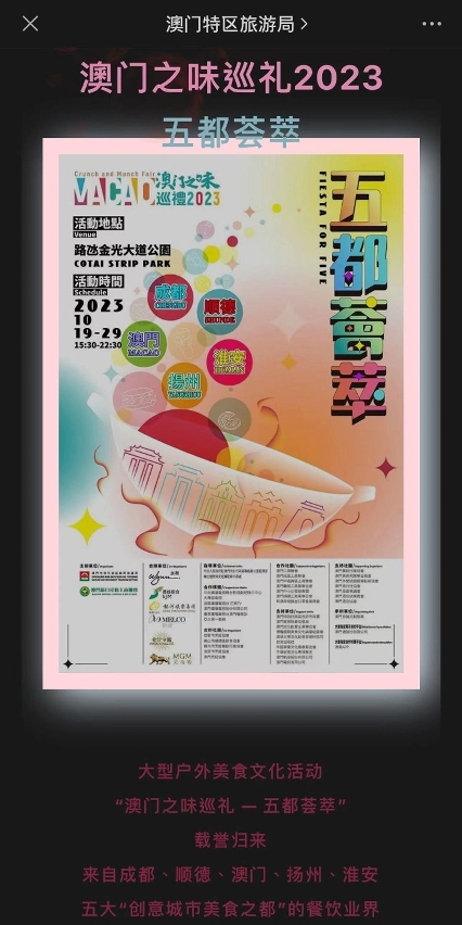 A segunda edição da “Crunch and Munch Fair in Macao – Fiesta for Five” foi promovida em conjunto com os principais meios de comunicação social do Interior da China. Até agora, a exposição mediática através da estação Guangdong Radio and Television atingiu uma audiência de 427 milhões, e houve ainda divulgação na China Media Group e na Mango TV da Televisão Hunan. Em simultâneo, a DST reforçou a promoção através de várias plataformas, como WeChat, Weibo, Xiaohongshu, Douyin, Tiktok, Facebook, Instagram, entre outras, sendo que, a exposição no WeChat atingiu 2,45 milhões de visionamentos, dando a sentir ao público o ambiente do evento para atrair os visitantes ao local para ir à procura dos diferentes “sabores”, dando mais um passo em frente na divulgação das várias atracções de Macau enquanto Cidade Criativa de Gastronomia.