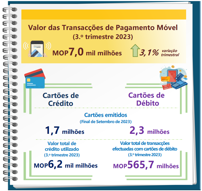 No terceiro trimestre de 2023, o crédito utilizado no período atingiu MOP6,2 mil milhões, o que representou um acréscimo de 4,6% em comparação com o trimestre anterior. O adiantamento de numerário atingiu MOP163,8 milhões, correspondendo a 2,7% do total do crédito utilizado no período. O número de transacções realizadas com cartões de crédito totalizou 10,2 milhões, o que representou um acréscimo de 11,6% face ao trimestre anterior. O montante do reembolso, incluindo os juros e despesas, foi de MOP6,5 mil milhões, o que representou um aumento de 11,7% relativamente ao trimestre anterior. Além disso, o número de transacções realizadas com cartões de débito (não incluindo o levantamento de numerário) totalizou 469,3 mil. O valor total de transacções efectuadas com cartões de débito foi de MOP565,7 milhões.