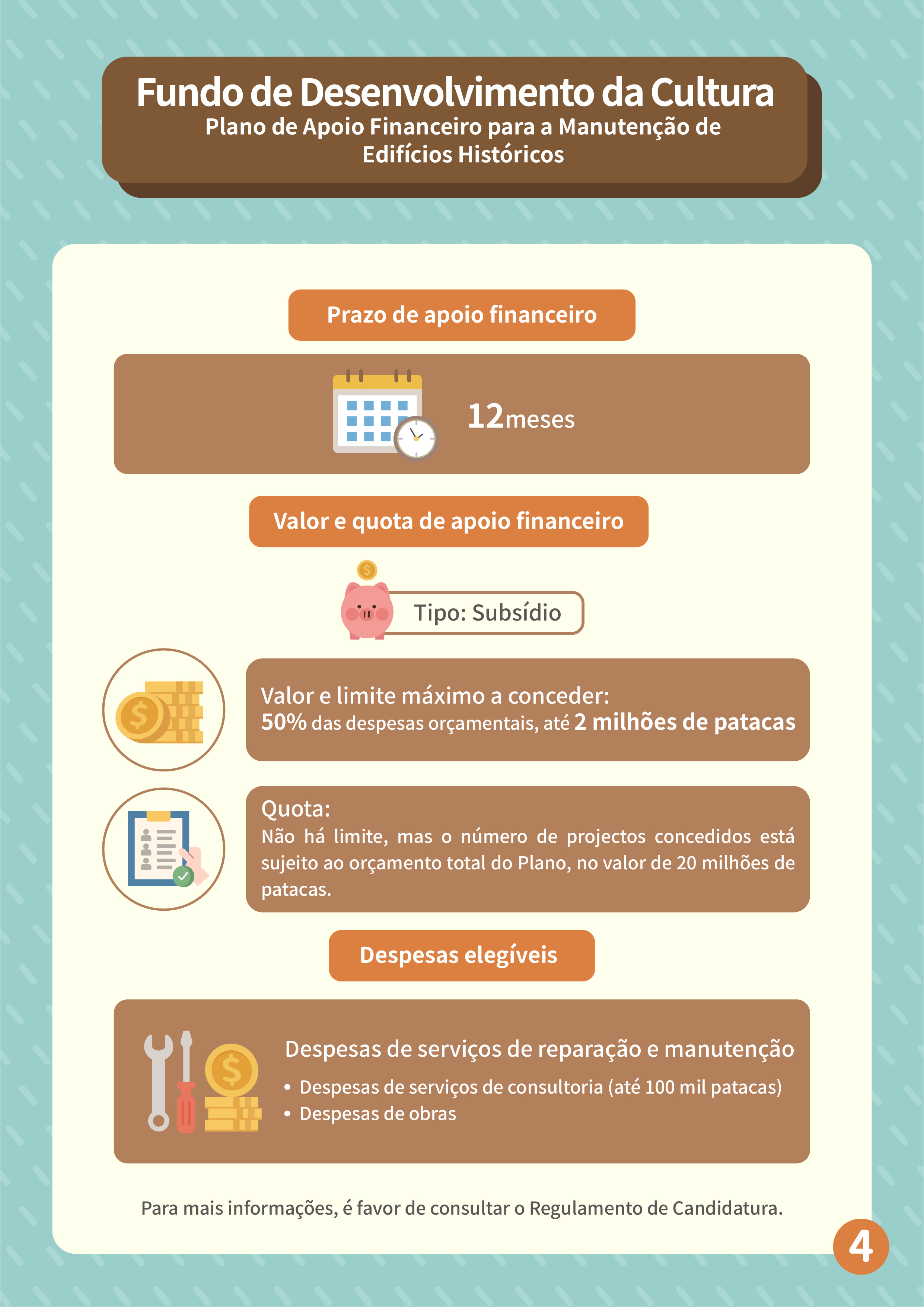 Para melhor promover a salvaguarda e a revitalização dos edifícios históricos, o Fundo de Desenvolvimento da Cultura (FDC) lança o “Plano de apoio financeiro para a manutenção de edifícios históricos”, de modo a aumentar a motivação dos proprietários de realizarem a manutenção regular por iniciativa própria e reforçar a salvaguarda dos edifícios patrimoniais privados e de interesse cultural.