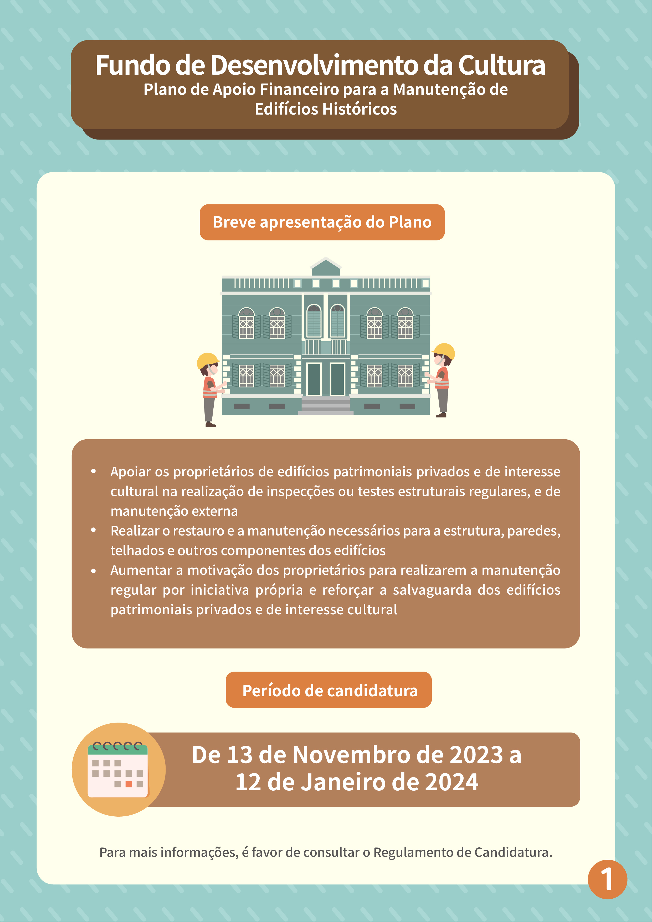 O período de candidatura é de 13 de Novembro de 2023 a 12 de Janeiro de 2024. O âmbito de apoio financeiro abrange os bens imóveis classificados, em vias de classificação e de interesse cultural, cujas obras de manutenção ainda não tenham sido iniciadas antes do período de candidatura, devendo a candidatura ser apresentada pelo proprietário ou representante legal do bem imóvel. Caso não seja possível determinar o estatuto dos direitos de propriedade ou o proprietário do bem imóvel seja considerado incontactável, a candidatura pode ser apresentada pelo possuidor ou detentor.