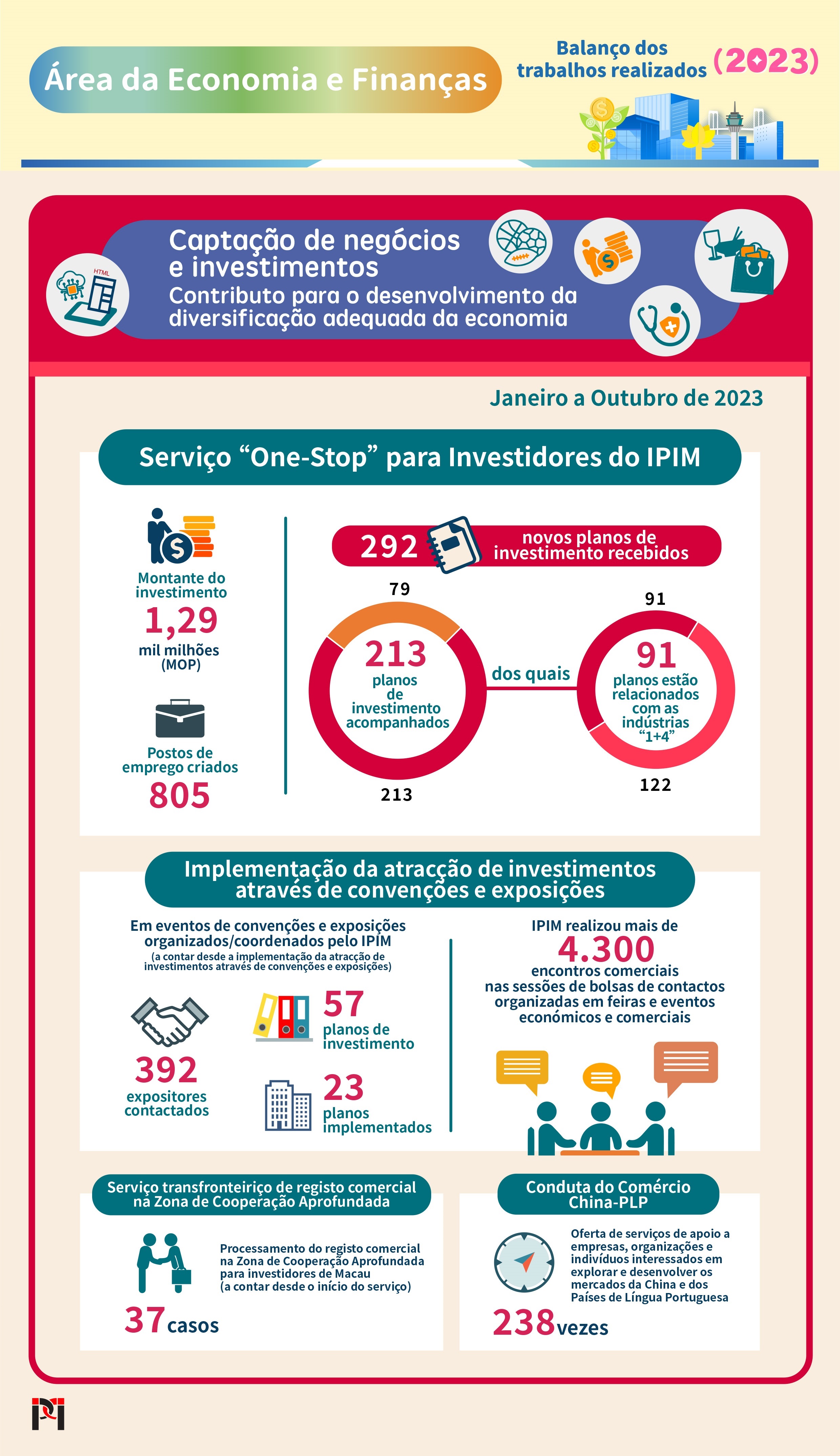 O IPIM continua a adoptar a forma de “posicionamento antes da exposição, acompanhamento ao longo da mesma, e seguimento após o evento”, utiliza as convenções e exposições para promover as vantagens comerciais de Macau-Hengqin, e ajudar as empresas a realizarem os seus investimentos. Nos eventos de convenções e exposições organizados/co-organizados pelo IPIM, contactou com 392 expositores, recebendo 57 projectos de investimento dos quais 23 foram concretizados, oriundos de locais como os países de língua portuguesa, o interior da China e outros, abrangendo diferentes ramos de big health, inovação tecnológica, cultura, turismo, comércio e indústrias de protecção ambiental.