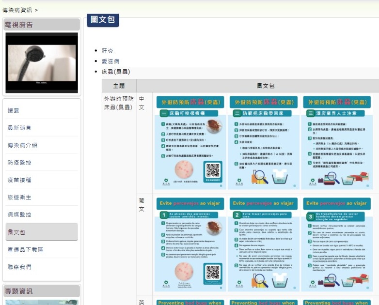Os Serviços de Saúde realizaram recentemente, em colaboração com a Direcção dos Serviços de Turismo e o Instituto de Acção Social, sessões de esclarecimento “Venham conhecer e prevenir os percevejos (Bed bugs)” para os trabalhadores dos sectores do turismo, da hotelaria, das agências de viagens, dos estabelecimentos de saunas e massagens e dos lares. O vídeo desta sessão de esclarecimento já se encontra disponível na página electrónica de Informações de Doenças Transmissíveis dos Serviços de Saúde. Além disso, foram produzidas infografias em várias línguas, incluindo chinês, português, inglês, coreano, indonésio e vietnamita. É bem-vinda a visita do sector e dos residentes, a fim de aumentar o alerta e tomar as devidas medidas de prevenção e de resposta, nomeadamente: