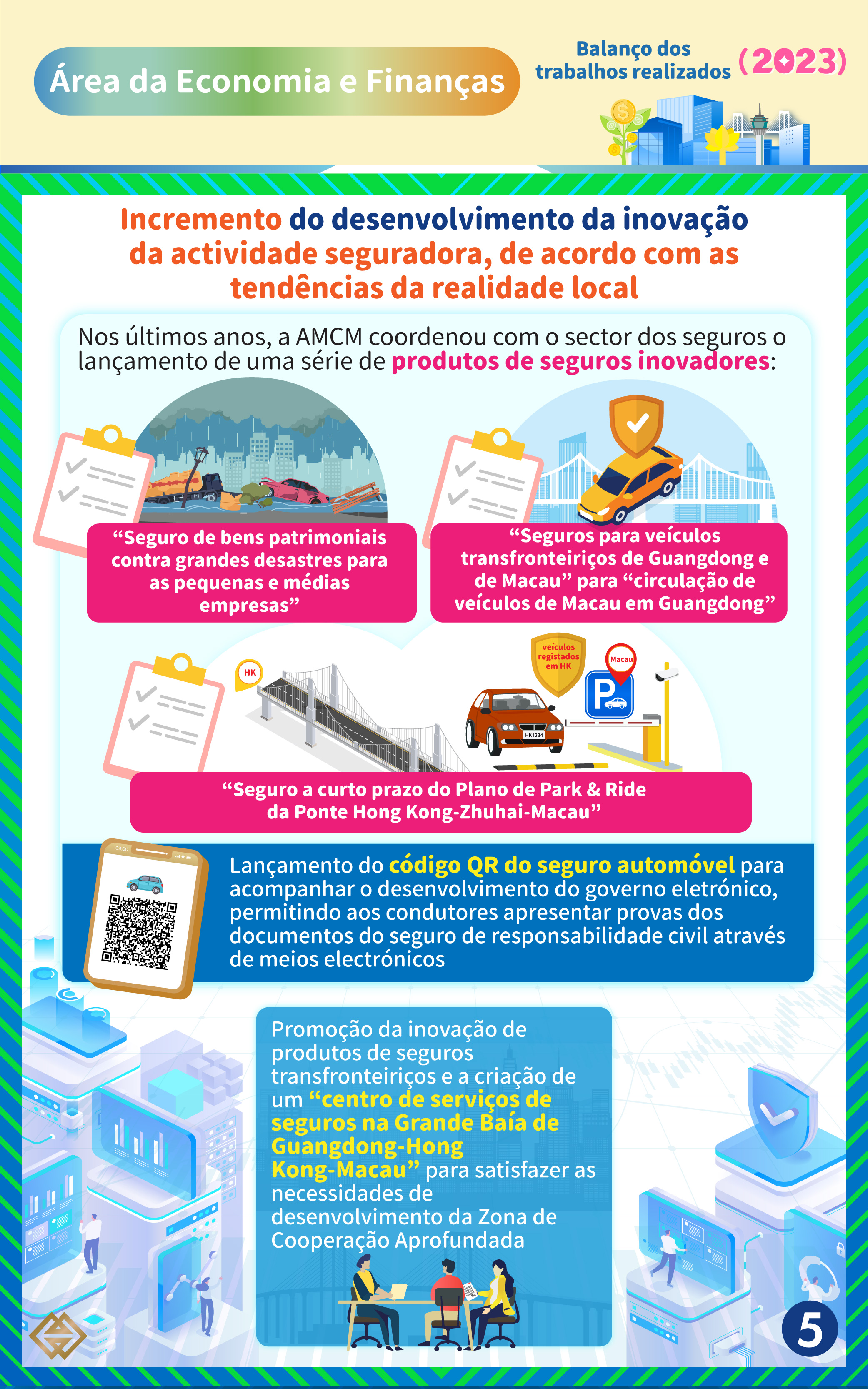 Nos últimos anos, a AMCM coordenou com o sector segurador o lançamento de uma série de produtos de seguros inovadores, incluindo o “Seguro de bens patrimoniais contra grandes desastres para as pequenas e médias empresas”, “Seguros para veículos transfronteiriços de Guangdong e de Macau” para a “circulação de veículos de Macau em Guangdong”, “Seguro a curto prazo do Plano de Park & Ride da Ponte Hong Kong-Zhuhai-Macau” e o lançamento do código QR do seguro automóvel para acompanhar o desenvolvimento do governo eletrónico, permitindo aos condutores apresentar provas dos documentos do seguro de responsabilidade civil através de meios electrónicos. Além disso, a AMCM está a promover a inovação de produtos de seguros transfronteiriços e a criação de um “centro de serviços de seguros na Grande Baía de Guangdong-Hong Kong-Macau” para satisfazer as necessidades de desenvolvimento da Zona de Cooperação Aprofundada.