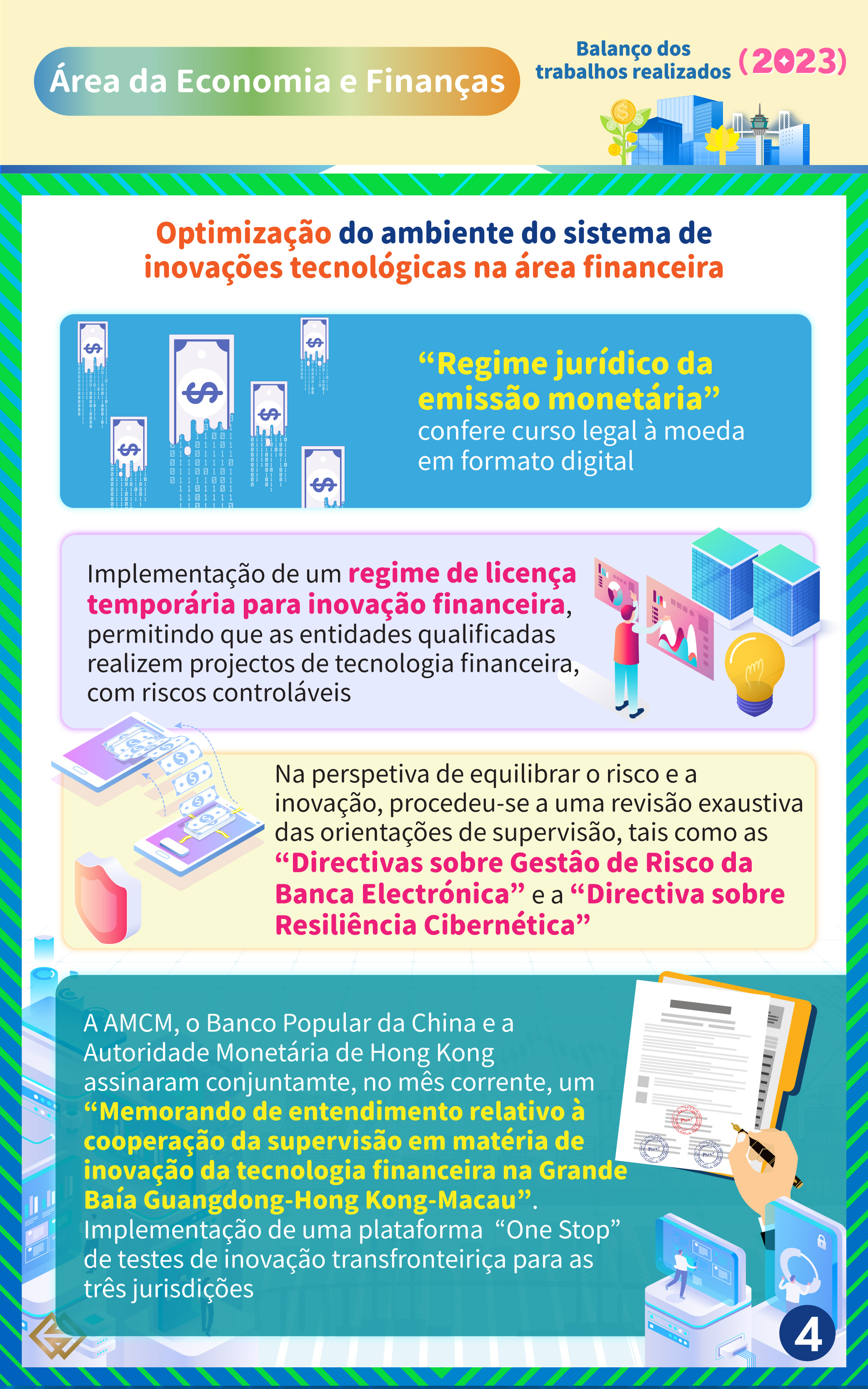 No ano corrente, a AMCM procedeu à reformulação do “Regime jurídico da emissão monetária”, conferindo curso legal à moeda em formato digital, implementando um regime de licenças temporárias para inovação financeira, permitindo às entidades qualificadas, com riscos controláveis, realizem actividades financeiras numa base experimental através da inovação tecnológica ou da inovação no modo de operação, a fim de promover a inovação tecnológica financeira.