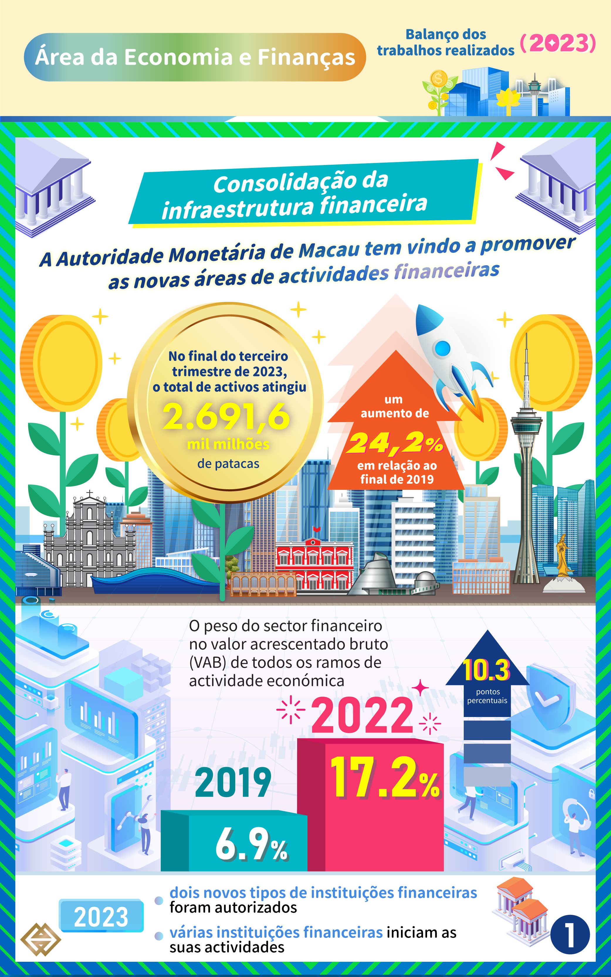 Em 2022, o peso do sector financeiro no valor acrescentado bruto (VAB) de todos os ramos de actividade económica foi de 17,2%, o que corresponde a um aumento de 10,3 pontos percentuais em relação aos 6,9% em 2019. No final do terceiro trimestre de 2023, o total de activos do sector financeiro em Macau atingiu 2.691,6 mil milhões de patacas, representando um aumento de 24,2% em relação ao final de 2019. Este ano, foram autorizados a operar em Macau dois novos tipos de instituições financeiras, e várias instituições financeiras autorizadas em 2022 iniciaram as suas actividades.