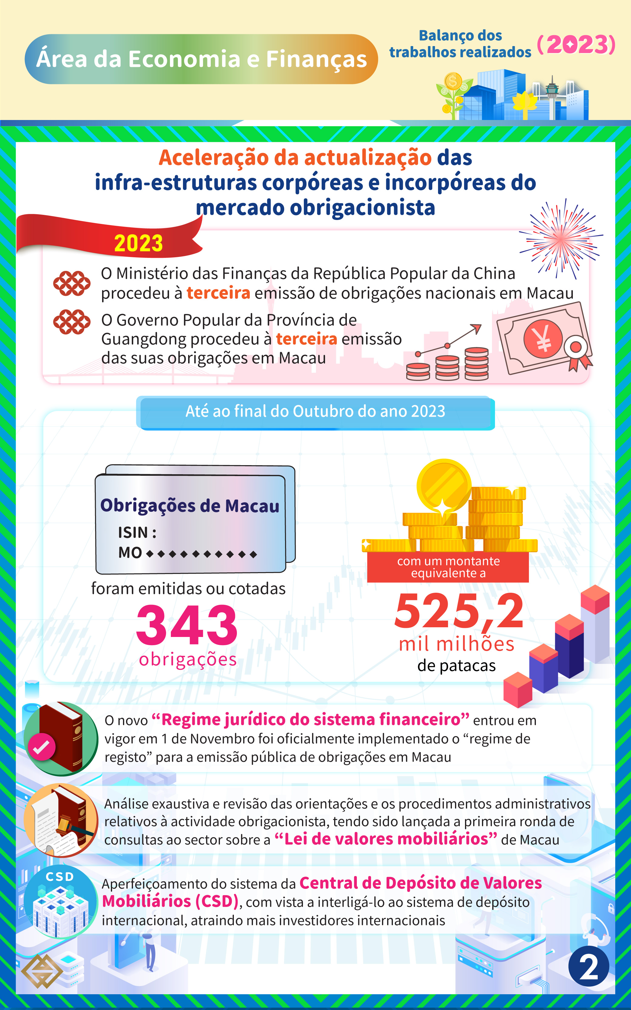 Em 2023, o Ministério das Finanças da República Popular da China procedeu á terceira emissão de obrigações nacionais em Macau, bem como apoiou o Governo Popular da Província de Guangdong na terceira emissão das suas obrigações em Macau. Até ao final do Outubro do ano corrente, foram emitidas ou cotadas 343 obrigações em Macau, com um montante equivalente a 525,2 mil milhões de patacas, as quais abrangem um vasto leque de obrigações: designadamente obrigações soberanas, obrigações de governos provinciais, obrigações de empresas, obrigações verdes, obrigações financeiras e obrigações de suplemento de capital.
