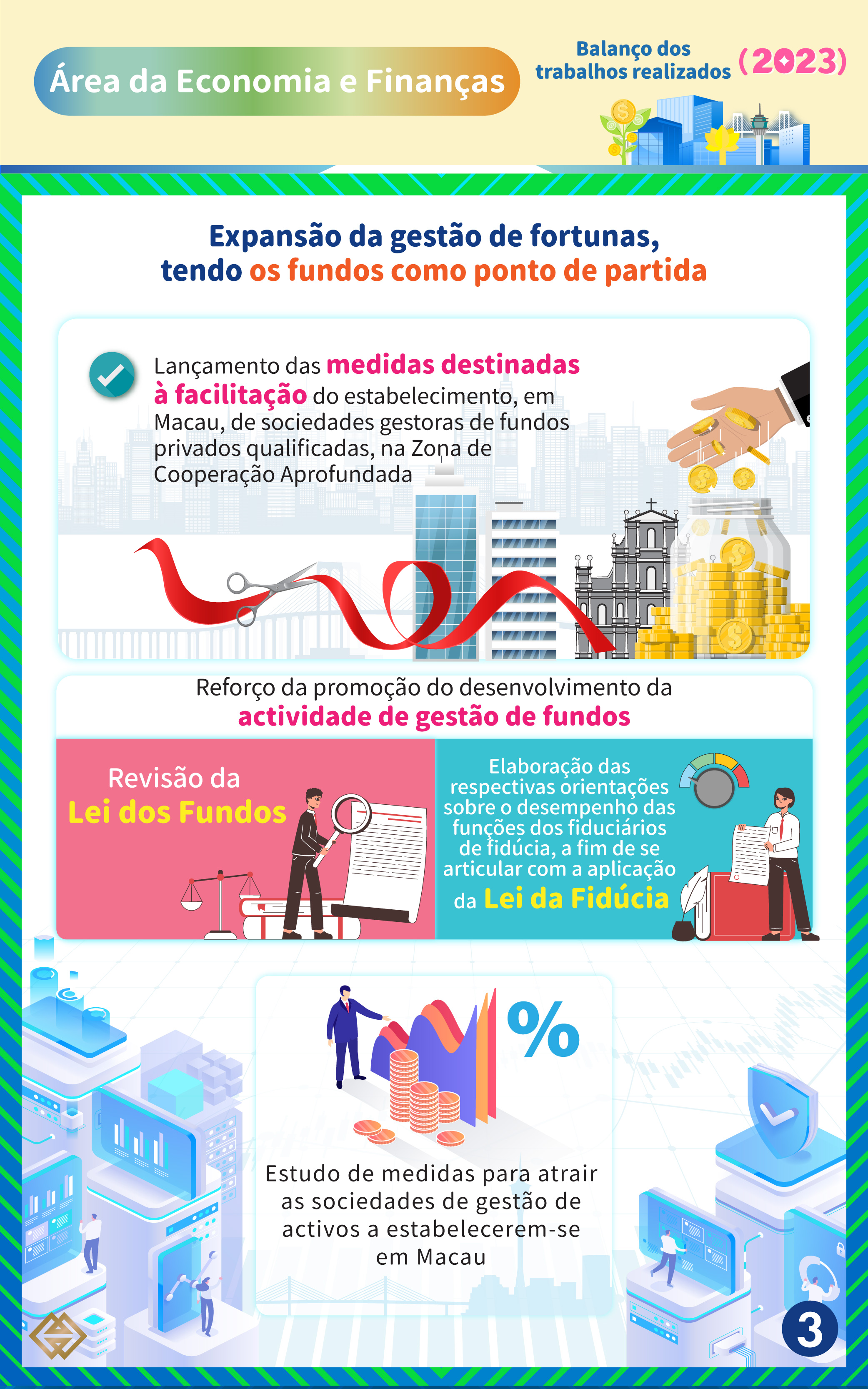 A AMCM lançou, em colaboração com as autoridades financeiras competentes da Zona de Cooperação Aprofundada, as medidas destinadas à facilitação do estabelecimento, em Macau, de sociedades gestoras de fundos privados qualificadas na Zona de Cooperação Aprofundada. Para reforçar a promoção do desenvolvimento da actividade de gestão de fundos, a AMCM está a promover a revisão da Lei dos Fundos e a elaborar as respectivas orientações sobre o desempenho das funções dos fiduciários de fidúcia, a fim de se articular com a aplicação da Lei da Fidúcia; Paralelamente, a AMCM está também a estudar medidas para atrair as sociedades de gestão de activos a estabelecerem-se em Macau.