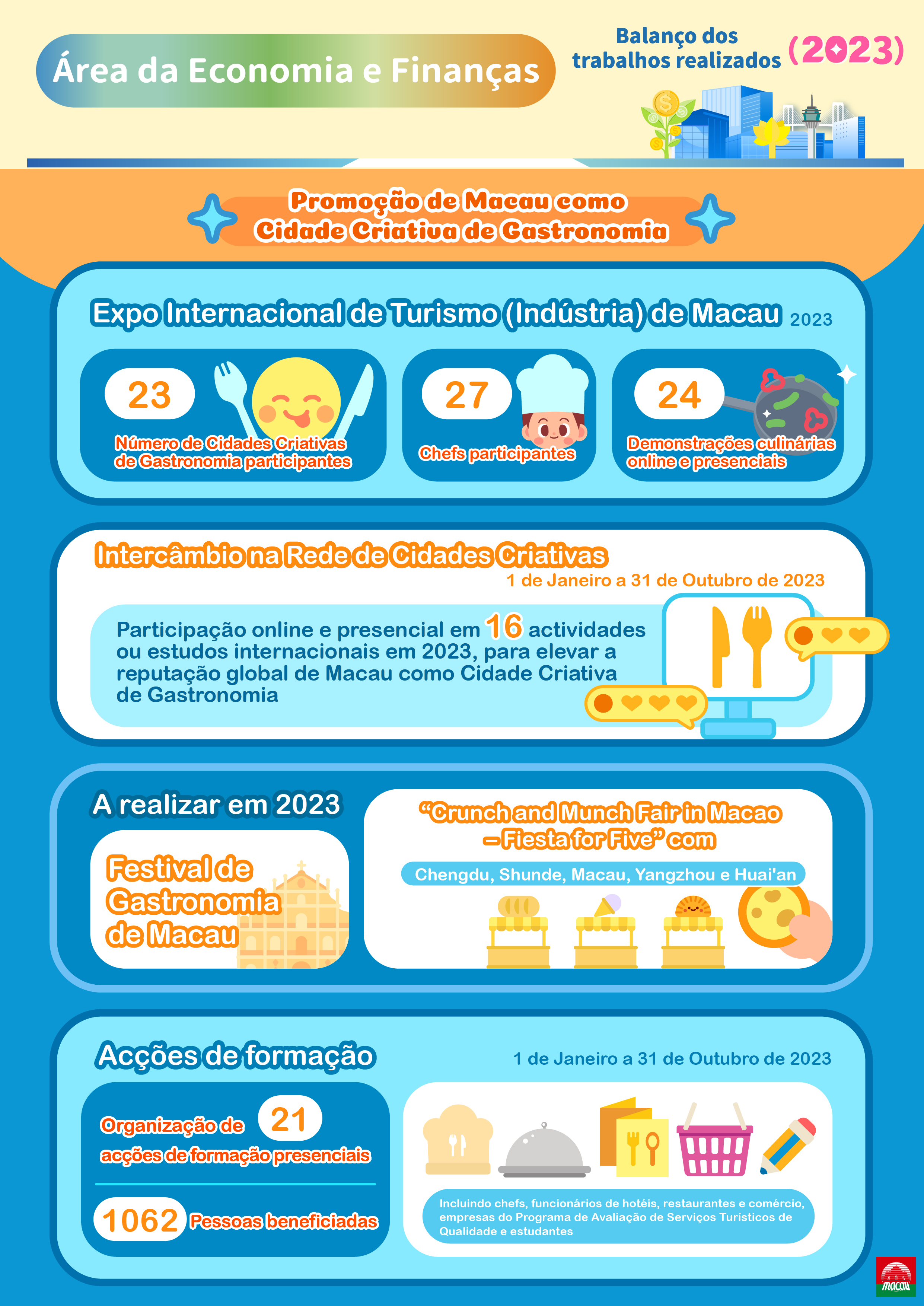 Após a designação de Macau como Cidade Criativa da UNESCO em Gastronomia, a DST tem promovido este cartão de visita internacional através de várias plataformas, e promovido activamente o intercâmbio com outras cidades gastronómicas de todo o mundo. Este ano reuniu chefs de 23 Cidades Criativas de Gastronomia para participar nas “Demonstrações de Cidades de Gastronomia” e organizou acções de formação para o sector. Realizou-se ainda, este ano, a segunda edição da “Crunch and Munch Fair in Macao – Fiesta for Five”.