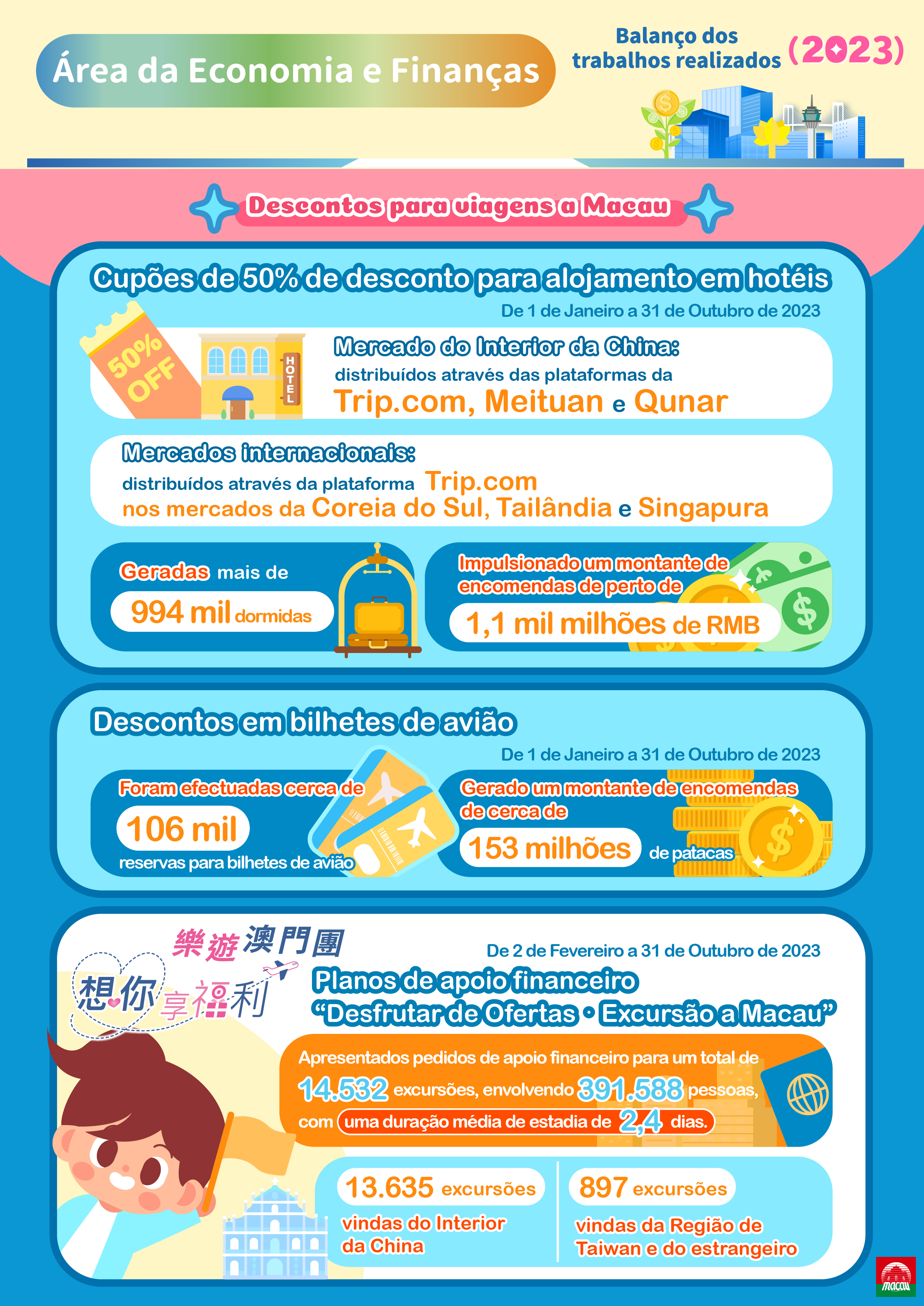 Através do programa “Desfrutar de Ofertas‧Excursão a Macau”, a DST tem lançado ofertas turísticas especiais bilhetes de avião a alojamento hoteleiro em Macau, direccionadas ao mercado do Interior da China e mercados no exterior. Até ao final de Outubro, cupões de hotéis com 50% de desconto lançados no âmbito da promoção impulsionaram reservas no valor de perto de 1,1 mil milhões de renminbis, enquanto as compras de bilhetes de avião com desconto levaram à realização de reservas no valor de perto de 153 milhões de patacas. Foi também lançado o programa “Desfrutar de Ofertas‧Excursão a Macau” visando atrair mais visitantes do Interior da China, da região de Taiwan e mercados internacionais a visitarem Macau em excursões. De 2 de Fevereiro a 31 de Outubro deste ano, foram recebidos pedidos de apoio financeiro relativos a 14.532 grupos turísticos.