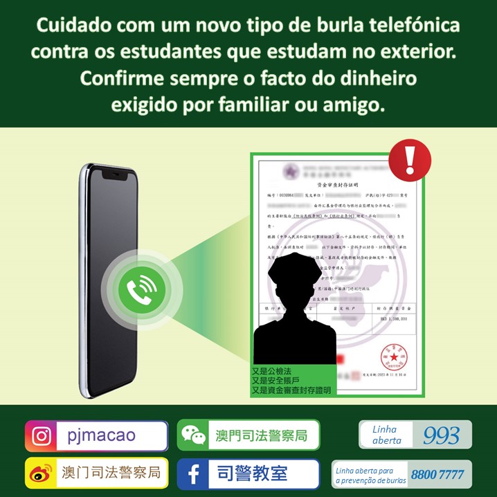 Nos últimos dias, a PJ recebeu uma denúncia de burla telefónica de um indivíduo cujo filho, a estudar no exterior, caiu numa armadinha de burla telefónica, do tipo de “fingir pessoal de serviços públicos, ministério público e entidade de justiça”, tendo feito uma remessa bancária de grande montante para os burlões, de dinheiro que estava depositado num banco no exterior. O filho foi ainda instigado pelos burlões para pedir ajuda da família para levantar outra grande quantia de dinheiro e transferi-lo todo para eles, o que lhe causou um prejuízo de cerca de 3.5 milhões de patacas.