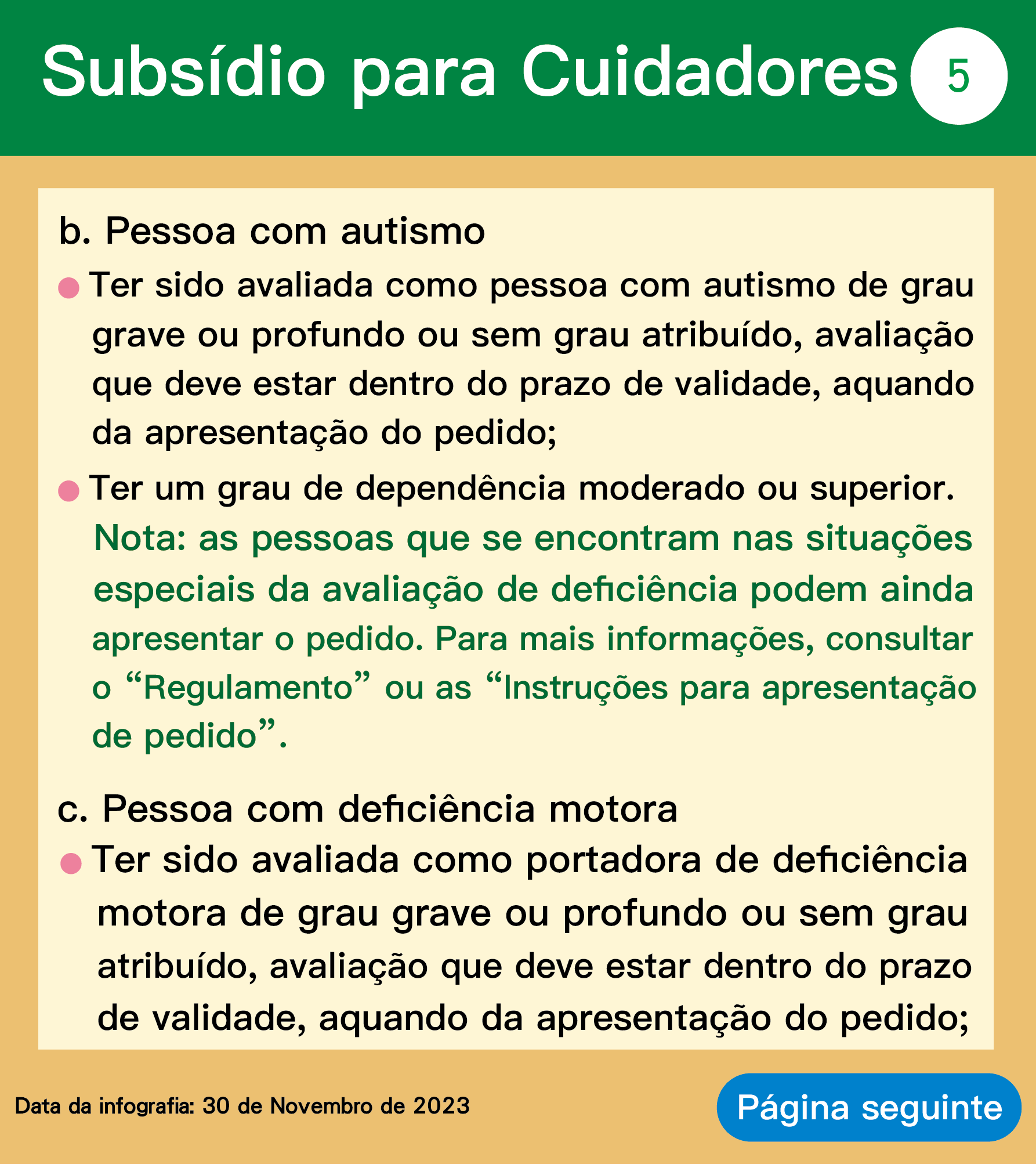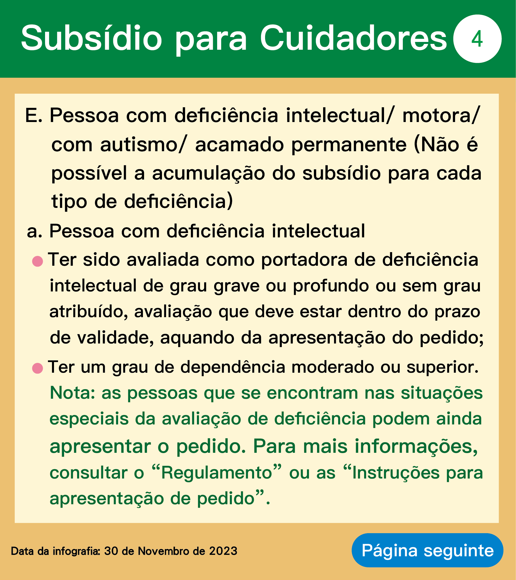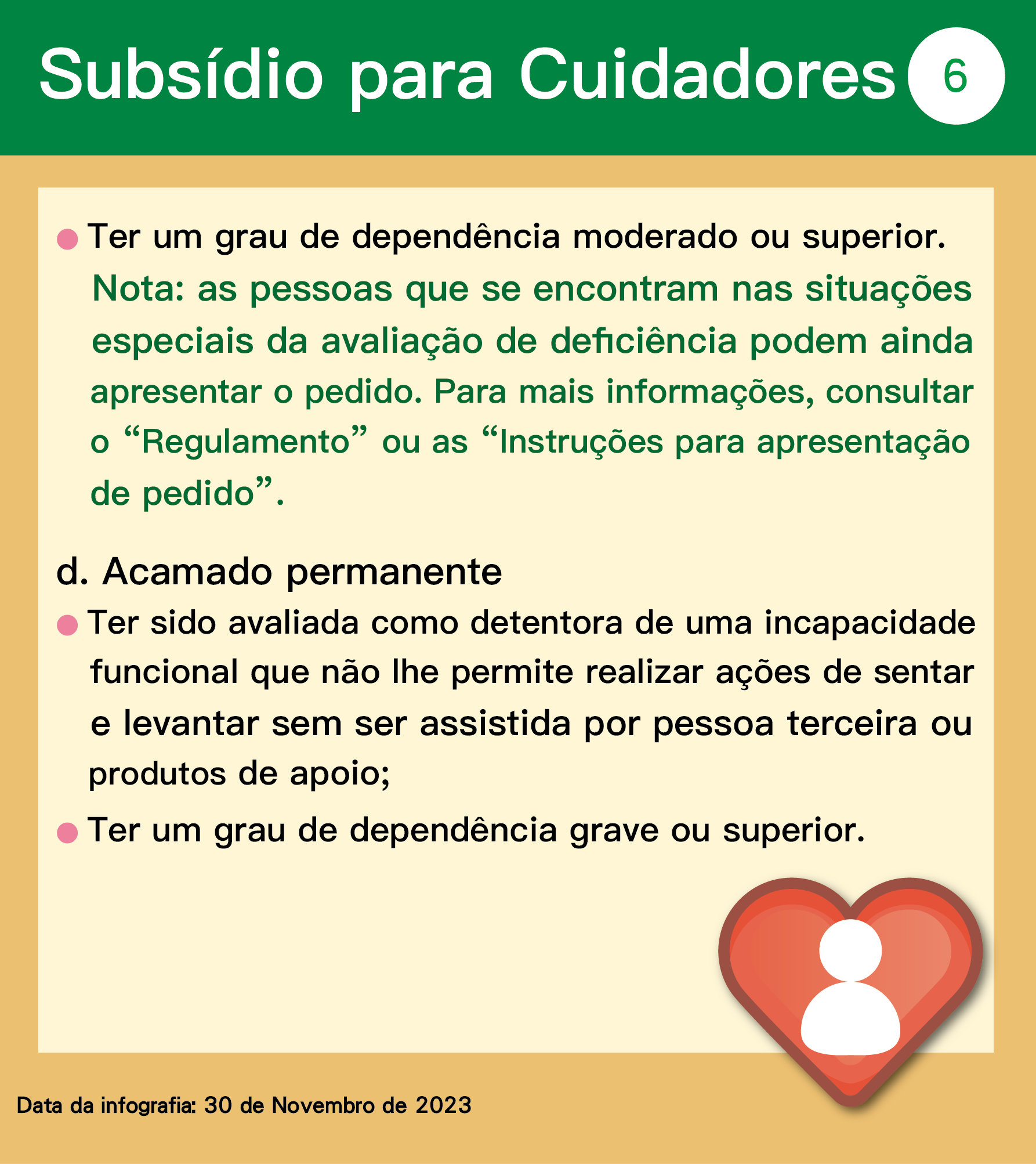 Uma vez que o Subsídio para Cuidadores passa a ser medida permanente, o objectivo da política mantém-se inalterado, o qual visa conceder um subsídio especial a indivíduos com reduzidos recursos económicos que, necessitem de recorrer a cuidados continuados e intensivos, de modo a atender às suas necessidades de cuidados na vida. Os quatro tipos de pessoas correspondentes aos requisitos a seguir mencionado, definidos no Regulamento, podem, de acordo com o estipulado, apresentar o pedido ao IAS, não tendo termo para apresentação de pedido: