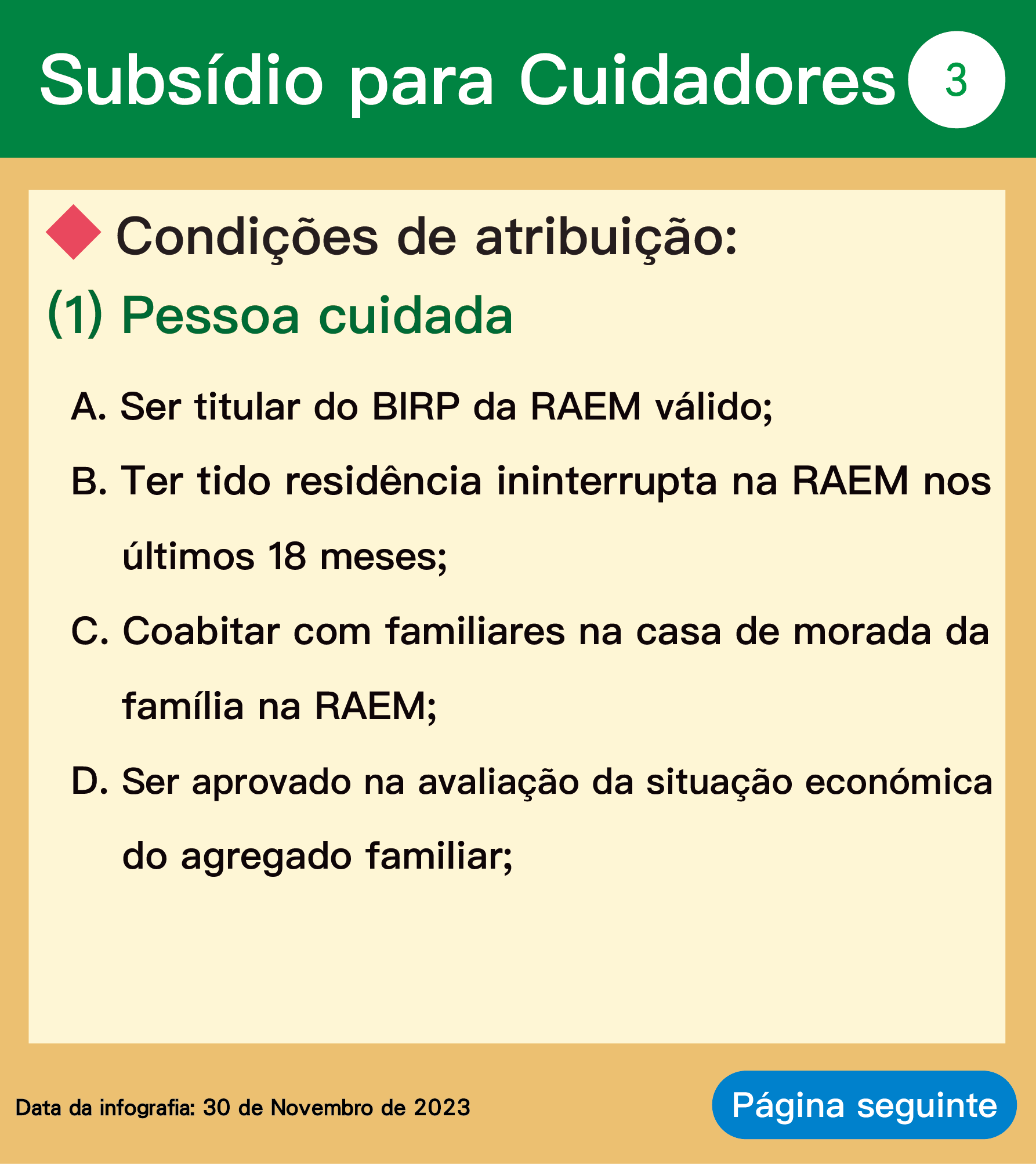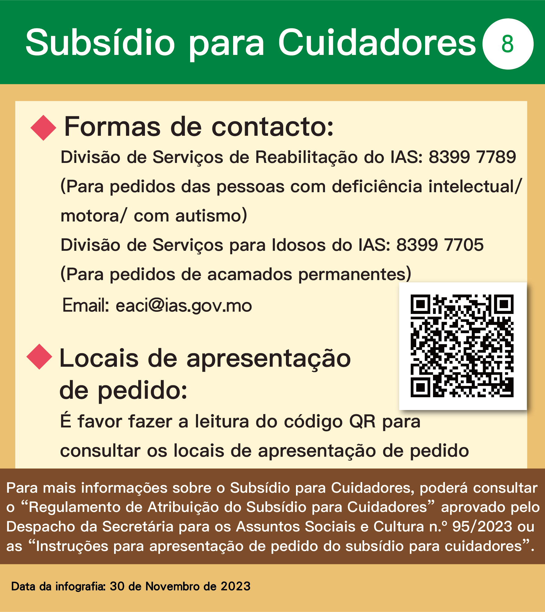 O “Regulamento de Atribuição do Subsídio para Cuidadores” (adiante designado por Regulamento) aprovado pelo Despacho da Secretária para os Assuntos Sociais e Cultura n.º 95/2023, entra em vigor no dia 1 de Dezembro. Nesta conformidade, o Subsídio para Cuidadores passa a ser, oficialmente, uma medida permanente. O Regulamento define o regime de atribuição e a disponibilização do respectivo subsídio e o Instituto de Acção Social (IAS) irá, de acordo com o estipulado no Regulamento, acompanhar os trabalhos relativos ao pedido, à aprovação, à atribuição, à fiscalização, à revisão, etc.