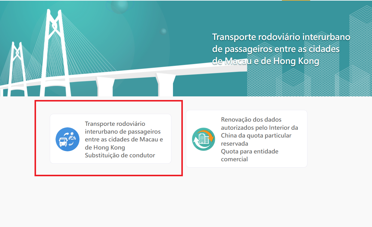 Para apresentar o pedido, as empresas exploradoras de autocarros ou veículos de aluguer transfronteiriços entre Hong Kong e Macau ou os requerentes devem aceder à página electrónica https://app.dsat.gov.mo, seleccionar o respectivo serviço (transporte transfronteiriço de passageiros entre Hong Kong e Macau), preencher as informações e carregar os documentos necessários segundo as instruções. A DSAT relembra que é necessário preencher os dados de todos os condutores da nova combinação, de modo a não afectar a habilitação de condução dos interessados; e alerta que durante o período do pedido de substituição de condutor, todos os condutores substituídos e os novos condutores não podem conduzir veículos que circulem entre Hong Kong e Macau através da Ponte Hong Kong-Zhuhai-Macau.