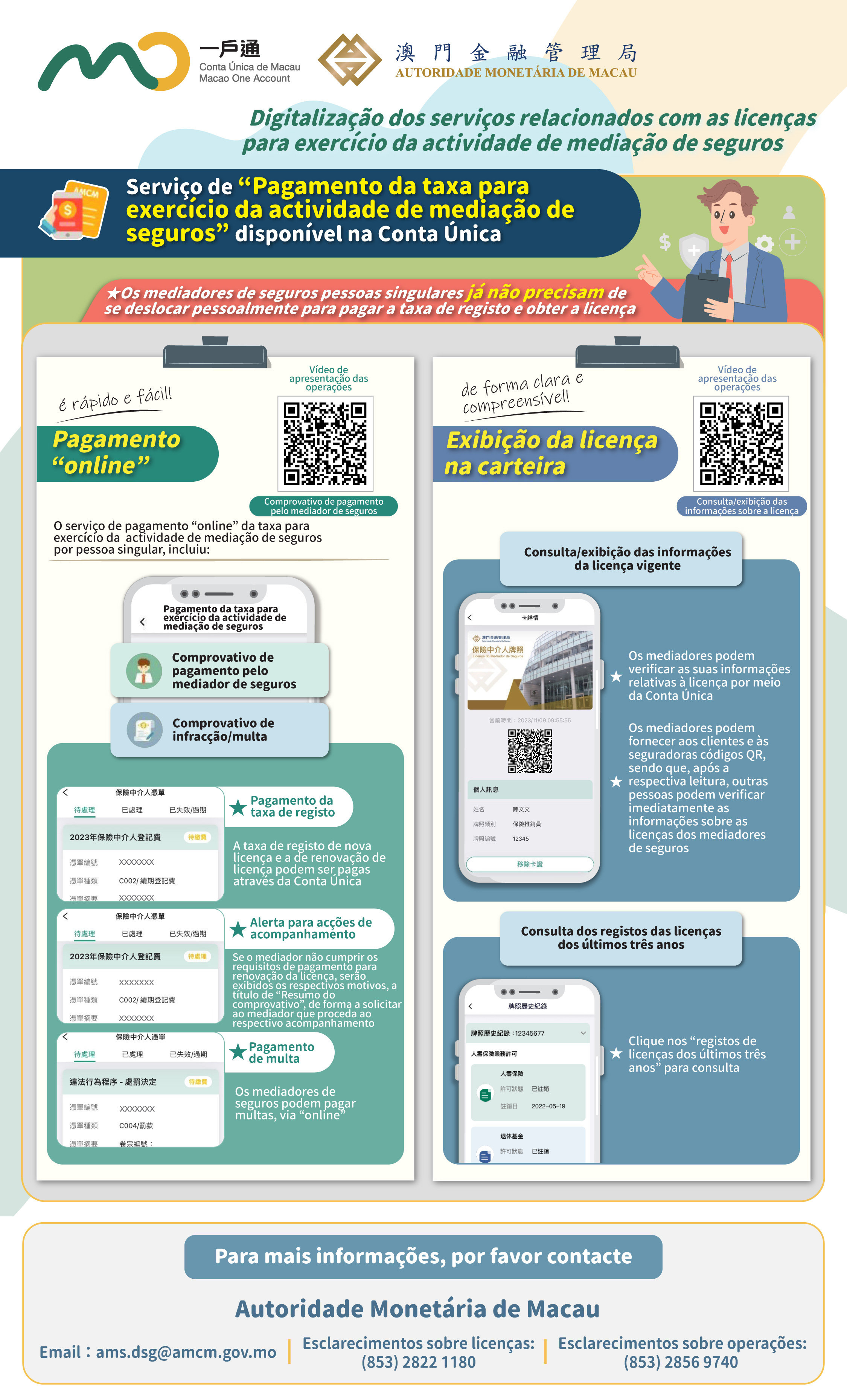 A AMCM continuará a proceder à revisão e optimização dos seus serviços, de modo a proporcionar maior facilidade aos mediadores de seguros (pessoas singulares). Para mais informações sobre a digitalização das licenças para exercício da actividade de mediação de seguros, por favor aceda à página electrónica temática da AMCM (https://www.amcm.gov.mo/pt/insurance-sector/authorised-insurance-intermediaries/e-payment) para consultar a respectiva infografia, vídeos de demonstração e outras informações relevantes.