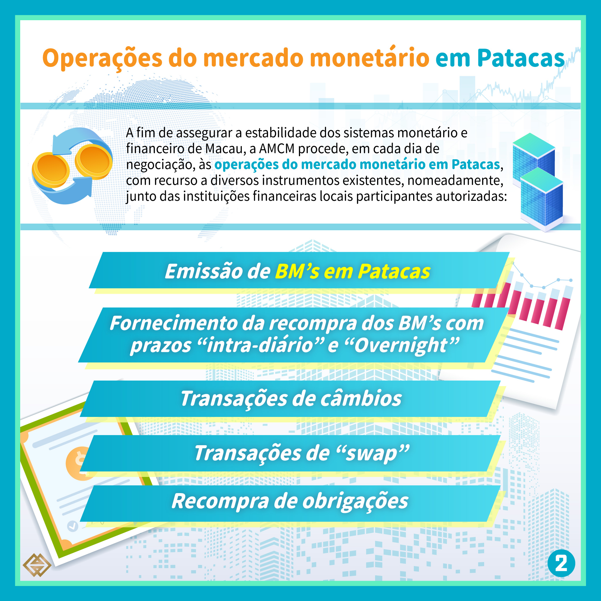 A fim de assegurar a estabilidade dos sistemas monetário e financeiro de Macau, a AMCM procede, em cada dia de negociação, às operações do mercado monetário em Patacas, com recurso a diversos instrumentos existentes, nomeadamente da emissão de BM’s em Patacas junto das instituições financeiras locais participantes autorizadas, do fornecimento da recompra dos BM’s com prazos “intra-diário” e “Overnight”, das transações de câmbios, das transações de “swap” e da recompra de obrigações, sendo que as instituições financeiras podem utilizar os respectivos instrumentos de gestão de fundos para mobilizar os seus fundos.