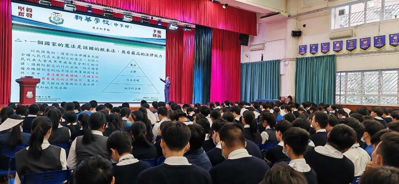 Para comemorar o 30.º aniversário da promulgação da Lei Básica de Macau, aprofundar os conhecimentos dos alunos do ensino secundário sobre a Constituição da China, a Lei Básica de Macau e a Lei relativa à defesa da segurança do Estado, e no intuito de criar um bom ambiente para conhecer, cumprir e proteger a lei, o Centro de Estudos “Um País, Dois Sistemas” da Universidade Politécnica de Macau realizou, entre Janeiro e Dezembro de 2023, as palestras subordinadas ao tema de “Introdução da Constituição e da Lei Básica nas escolas”, de modo a ajudar os estudantes do ensino secundário a compreender o papel da Constituição da República Popular da China e o da Lei Básica de Macau na garantia da prosperidade e desenvolvimento a longo prazo de Macau e do bem-estar da população local. A iniciativa atraiu a participação de 30 escolas secundárias, tendo sido realizadas 41 palestras, contando com a participação de 8300 alunos, tendo sido muito bem recebida por participantes.