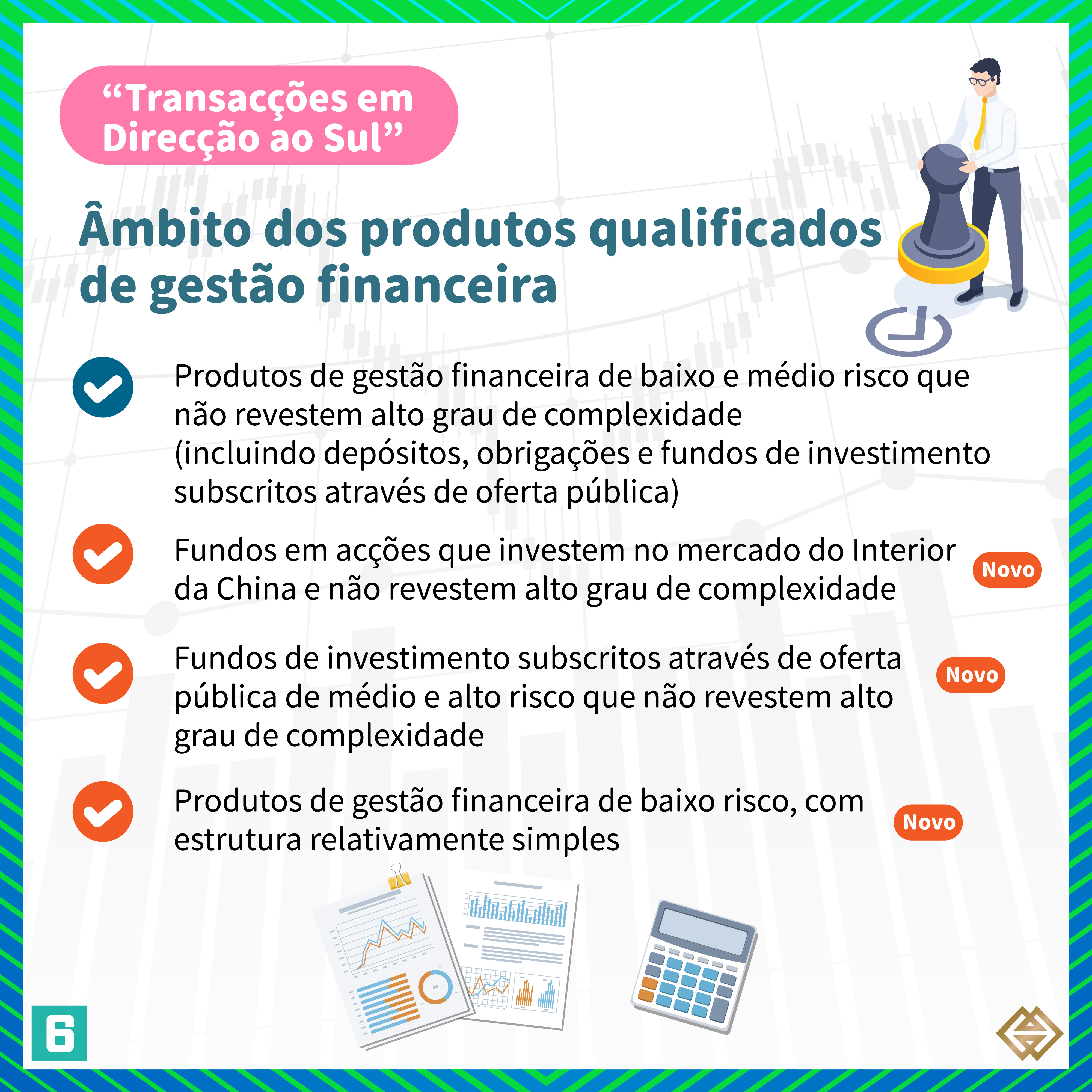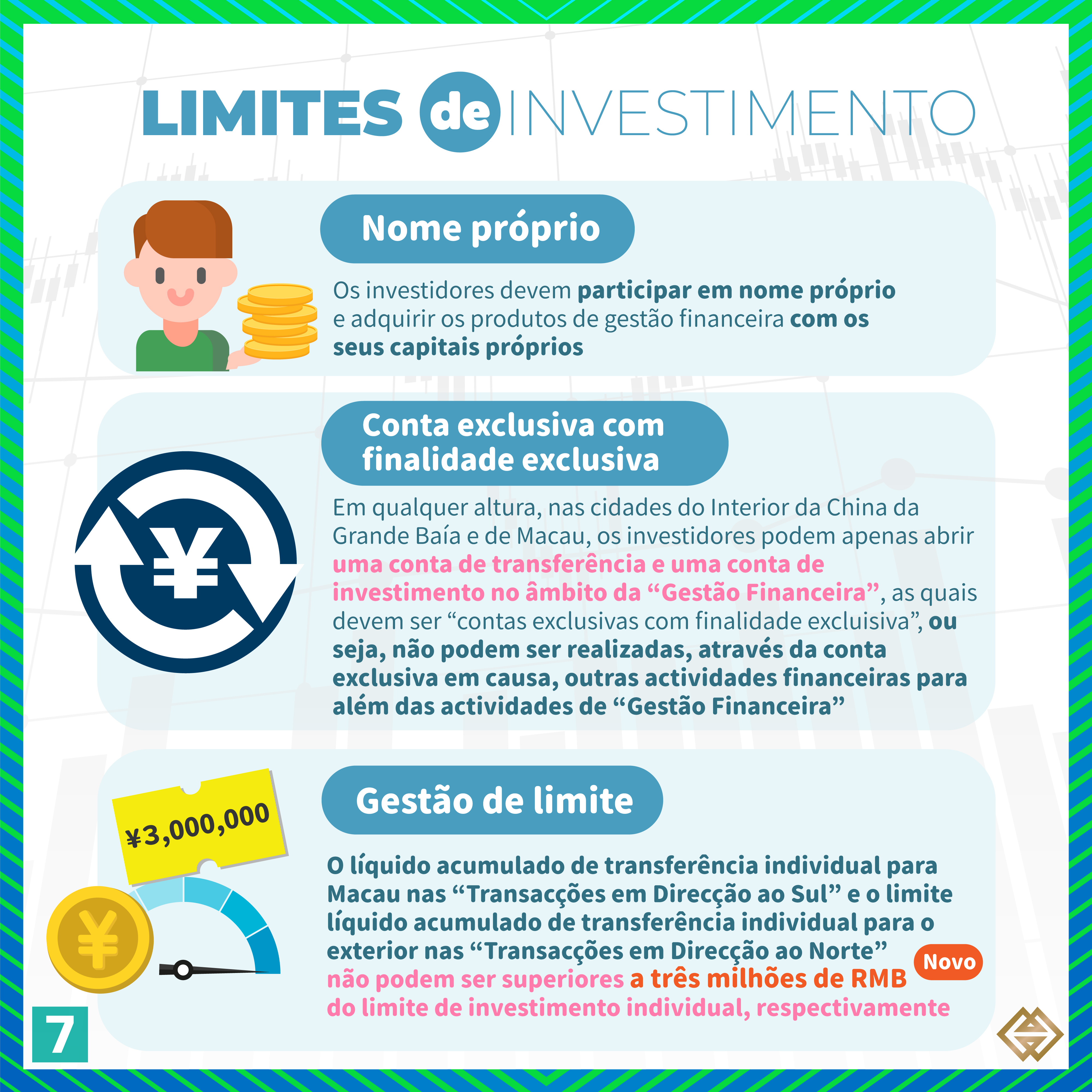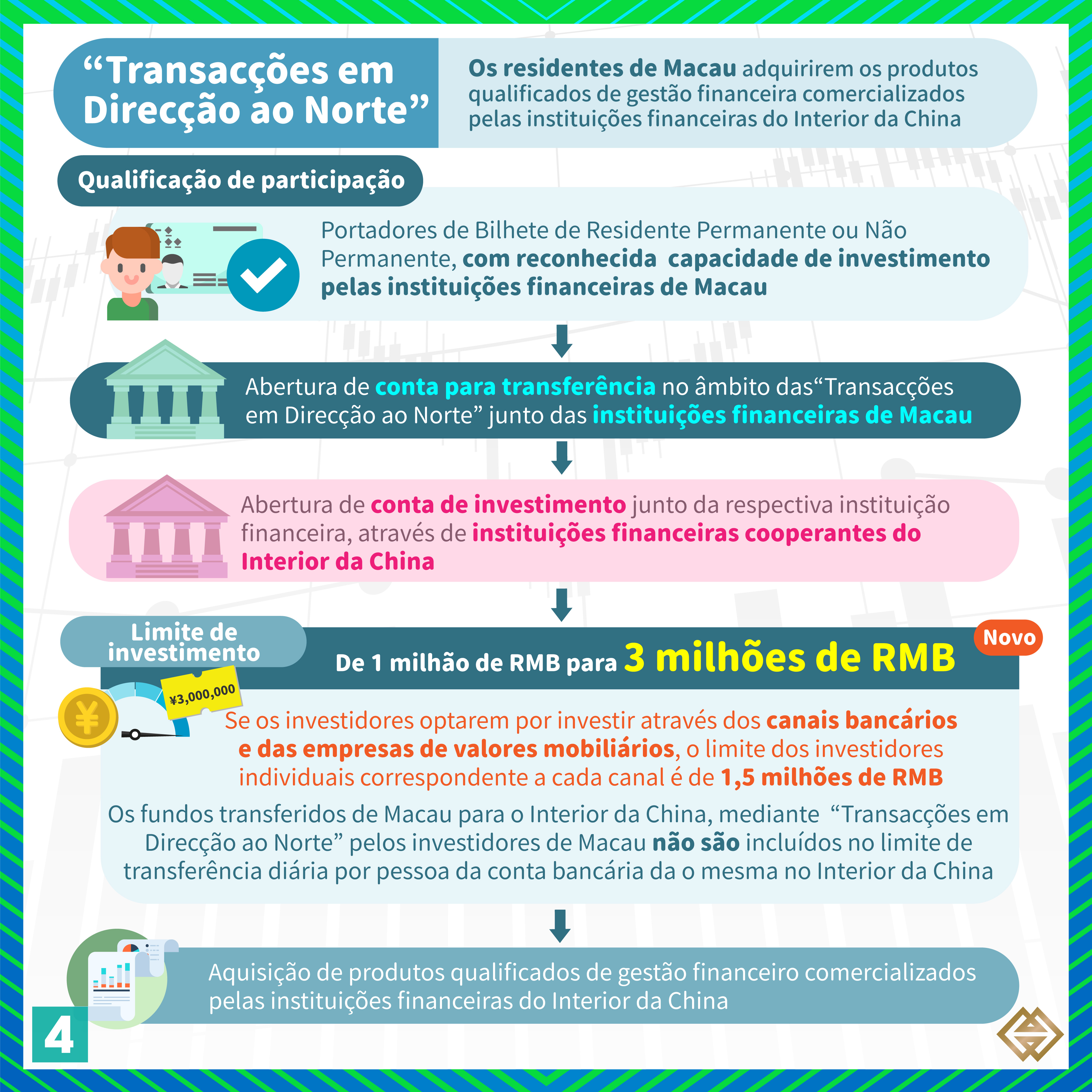 De acordo com a nova Regulamentação publicada pela AMCM, para além dos bancos de Macau autorizados a exercer a actividade de “Gestão Financeira Transfronteiriça”, as instituições financeiras licenciadas em Macau para prestar serviços relacionados com valores mobiliários (“empresas de valores mobiliários”) podem também exercer actividades de “Gestão Financeira Transfronteiriça”, em conformidade com as disposições da Regulamentação (para mais informações, consultar a lista de instituições participantes em https://www.amcm.gov.mo/zh-hant/news-notice/cross-border-financial-management/cross-border-financial-management-participating-agencies). Além disso, os investidores podem adquirir uma gama mais alargada de produtos qualificados de gestão financeira e o limite das operações dos investidores individuais foi aumentado de 1 milhão de RMB para 3 milhões de RMB. Se os investidores optarem por investir através dos canais bancários e das empresas de valores mobiliários, o limite dos investidores individuais correspondente a cada canal é de 1,5 milhões de RMB.