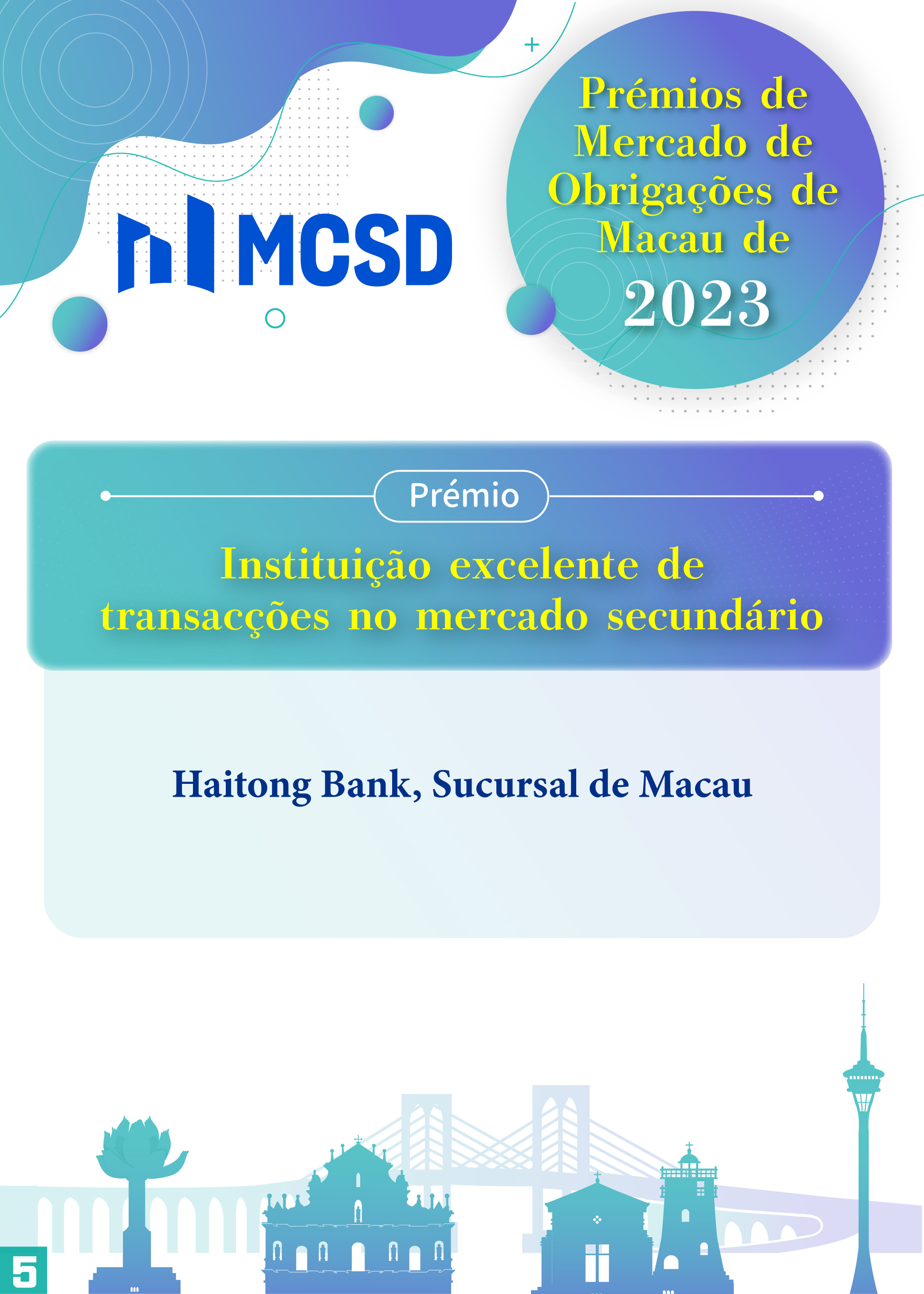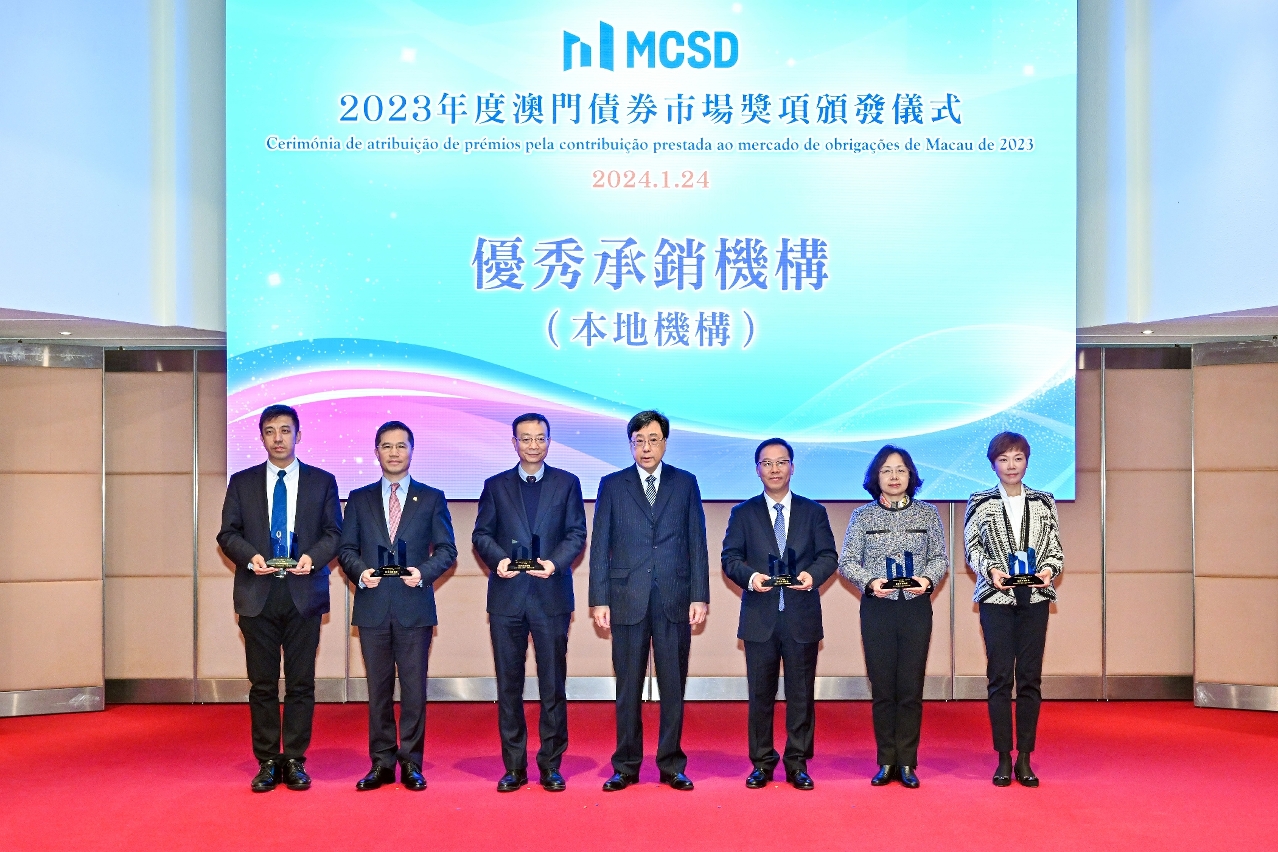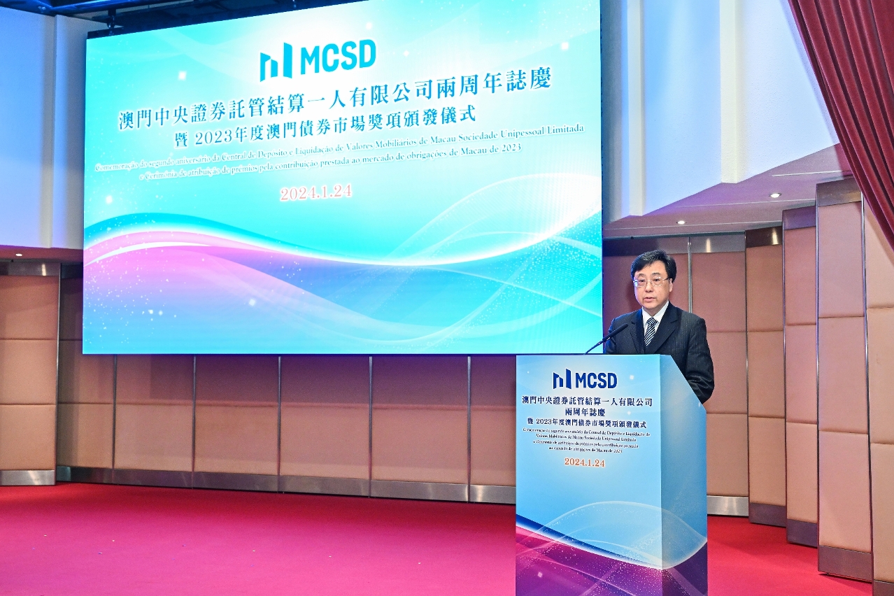 A Autoridade Monetária de Macau (AMCM) e a Central de Depósito e Liquidação de Valores Mobiliários de Macau Sociedade Unipessoal Limitada (MCSD) organizaram, em 24 de Janeiro, um evento com o objectivo de comemorar o segundo aniversário da MCSD na Salão de Lótus do Edifício World Trade Center, sendo a AMCM a unidade de suporte na qualidade de sócio maioritário. Durante o evento, foram atribuídos vários prémios para reconhecer a contribuição prestada pelos participantes para o mercado obrigacionista de Macau em 2023.