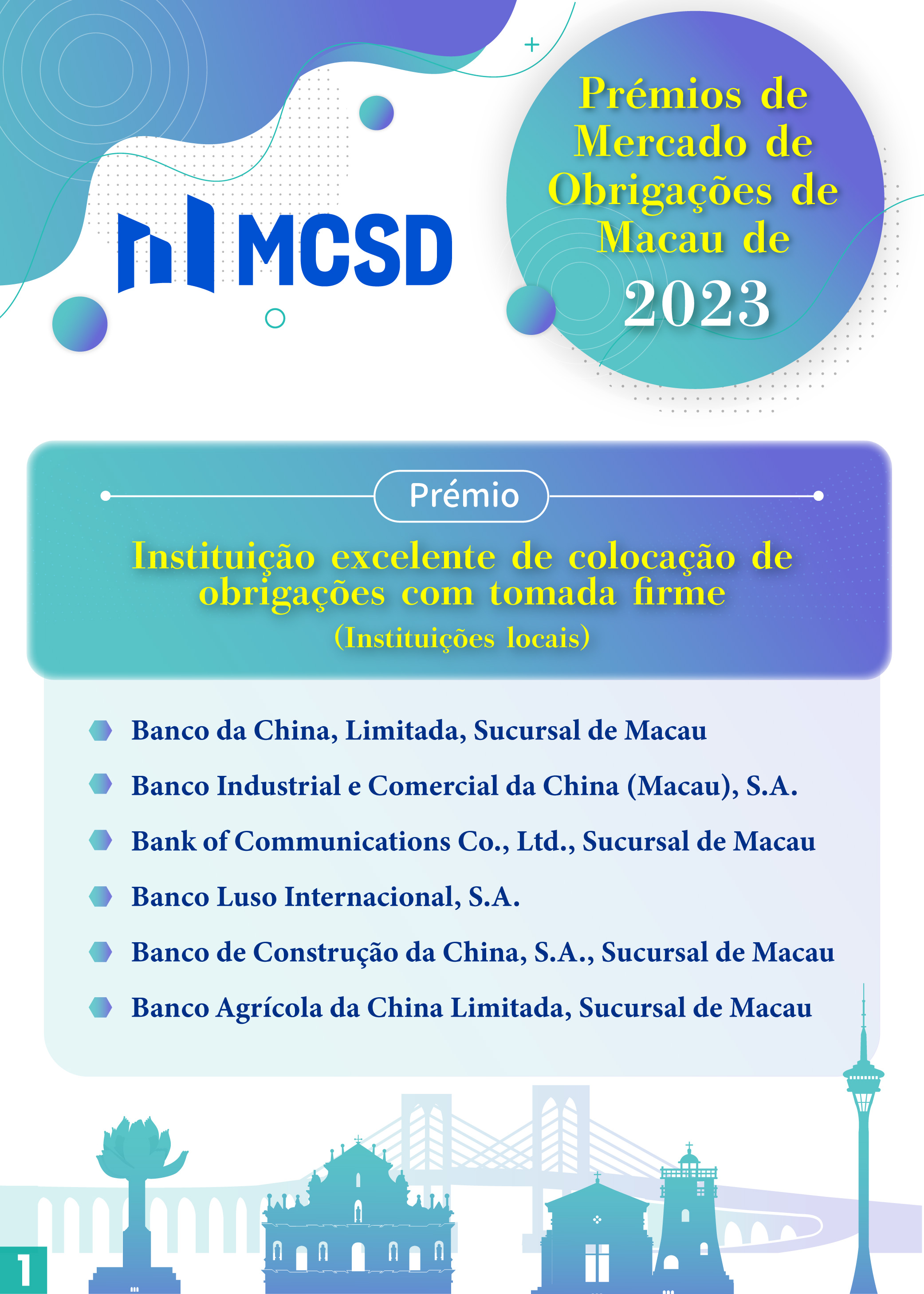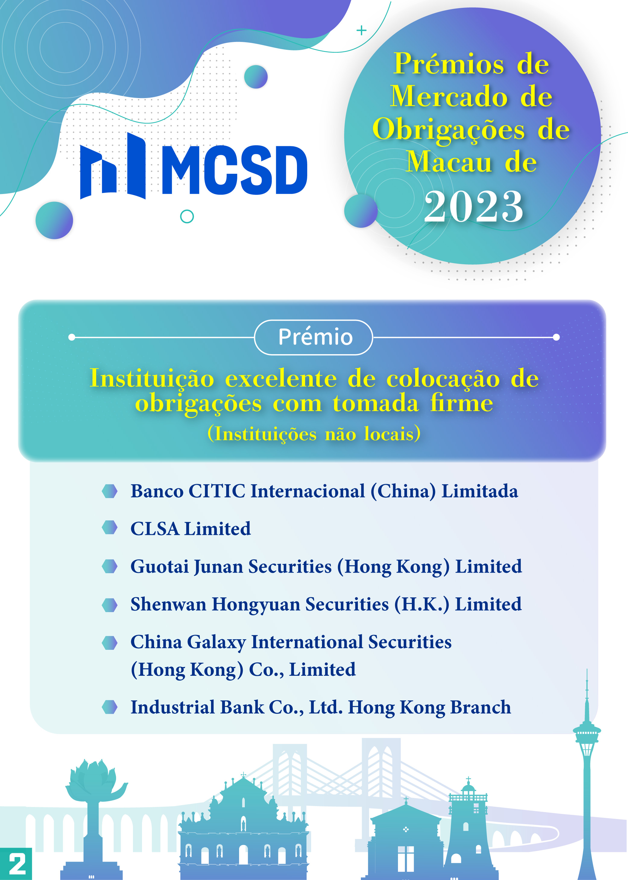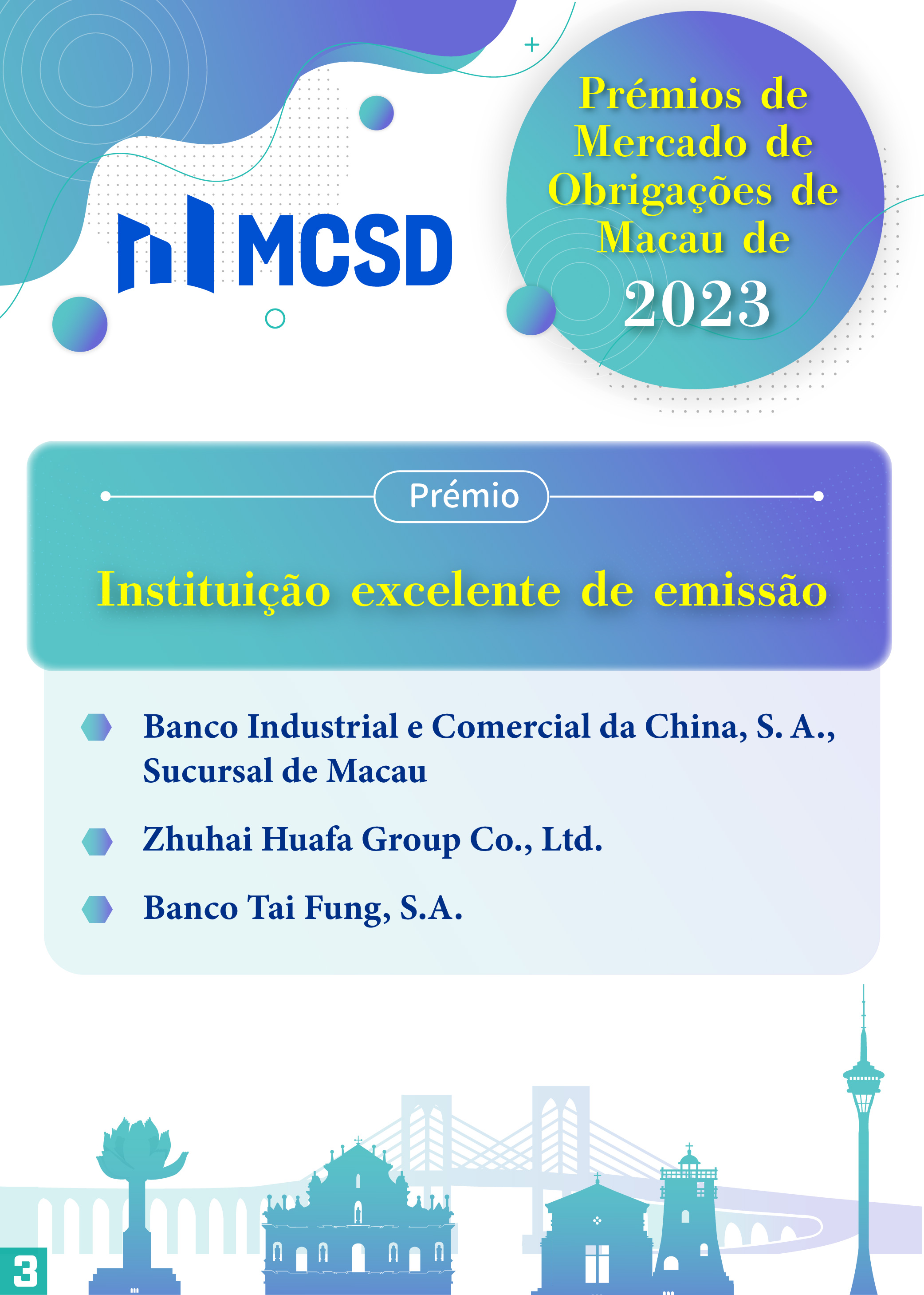 Com vista a manifestar os nossos agradecimentos pela contribuição prestada pelos participantes para o desenvolvimento do mercado obrigacionista de Macau em 2023, foram atribuídos vários prémios, incluindo os prémios já existentes: “Instituição excelente de colocação de obrigações com tomada firme”, “Instituição excelente de emissão” e “Instituição excelente de promoção no mercado exterior”, bem como os prémios novos: “Instituição com contributo excelente de ESG”, “Instituição excelente de transacções no mercado secundário” e “Instituição excelente de serviços profissionais”, tendo 27 instituições locais e do exterior sido premiadas.