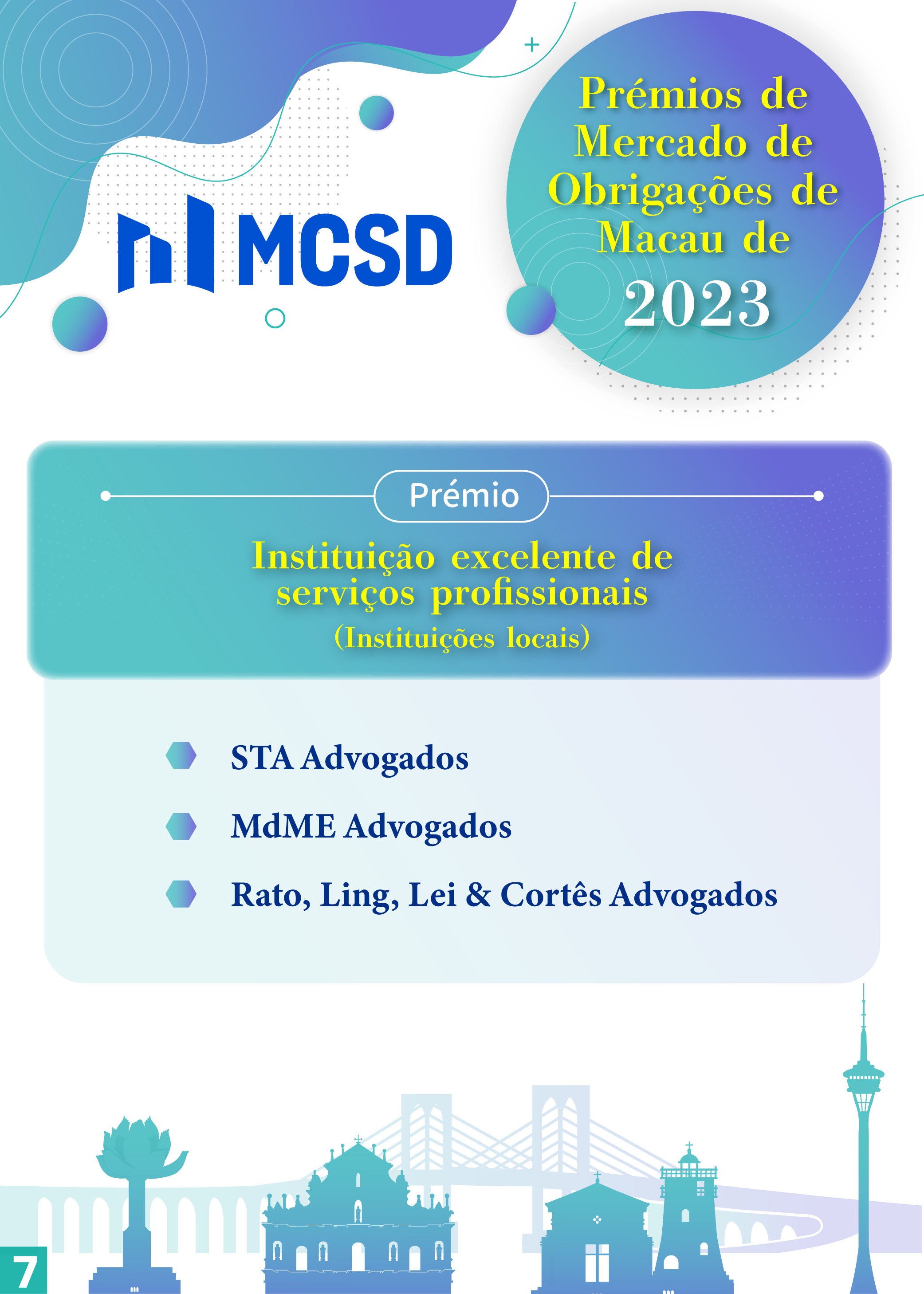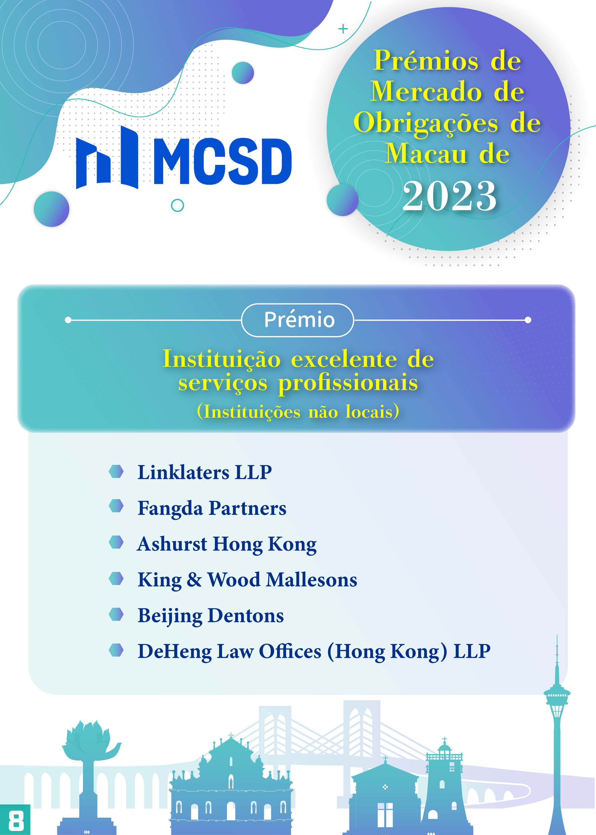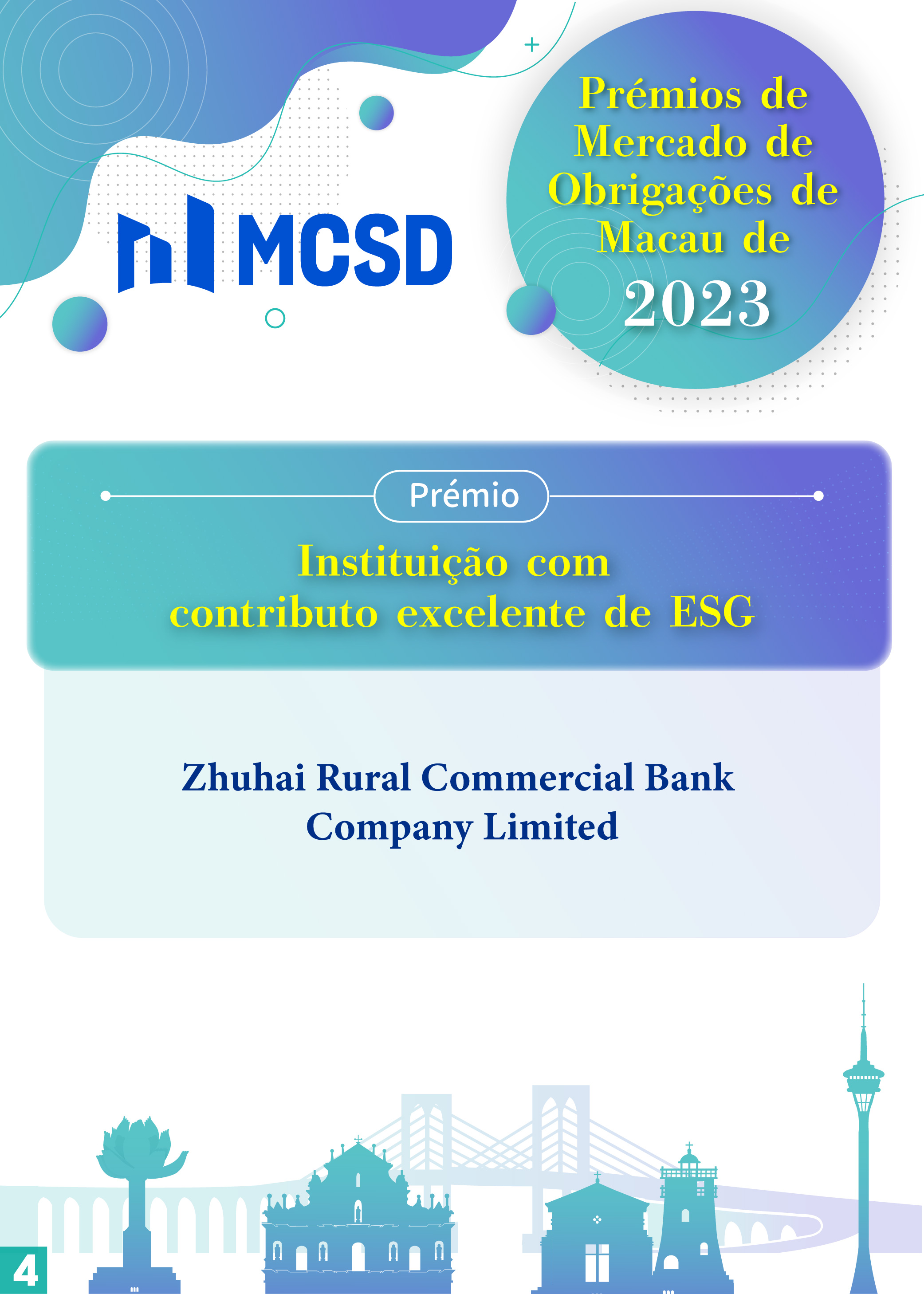 Com vista a manifestar os nossos agradecimentos pela contribuição prestada pelos participantes para o desenvolvimento do mercado obrigacionista de Macau em 2023, foram atribuídos vários prémios, incluindo os prémios já existentes: “Instituição excelente de colocação de obrigações com tomada firme”, “Instituição excelente de emissão” e “Instituição excelente de promoção no mercado exterior”, bem como os prémios novos: “Instituição com contributo excelente de ESG”, “Instituição excelente de transacções no mercado secundário” e “Instituição excelente de serviços profissionais”, tendo 27 instituições locais e do exterior sido premiadas.