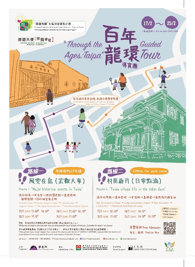 Uma outra actividade com apoio financeiro irá levar os participantes a conhecer os acontecimentos históricos relacionados com a Taipa e Macau e a vida dos residentes da Taipa no passado, através de dois roteiros pedonais de cerca de 60 minutos. Os roteiros incluem: “Major historical events in Taipa” (Rua do Pai Kok - Templo de Tin Hau - Museu da História da Taipa e Coloane - Largo do Carmo - Casas-Museu da Taipa - Rua Direita Carlos Eugénio, Taipa) e “Taipa village life in the olden days” (Templo Pak Tai na Taipa - Largo de Camões - Rua do Cunha - Feira do Carmo - Antiga Fábrica de Panchões Iec Long). As visitas guiadas gratuitas serão realizadas nos dois fins-de-semanas consecutivos dos dias 17 e 18, e 24 e 25 de Fevereiro, num total de 12 sessões. De acordo com as necessidades de cada língua, as visitas serão realizadas em cantonense, mandarim e inglês. Os interessados podem registar-se através do link: https://1ticks.com/event/K19nyws-
