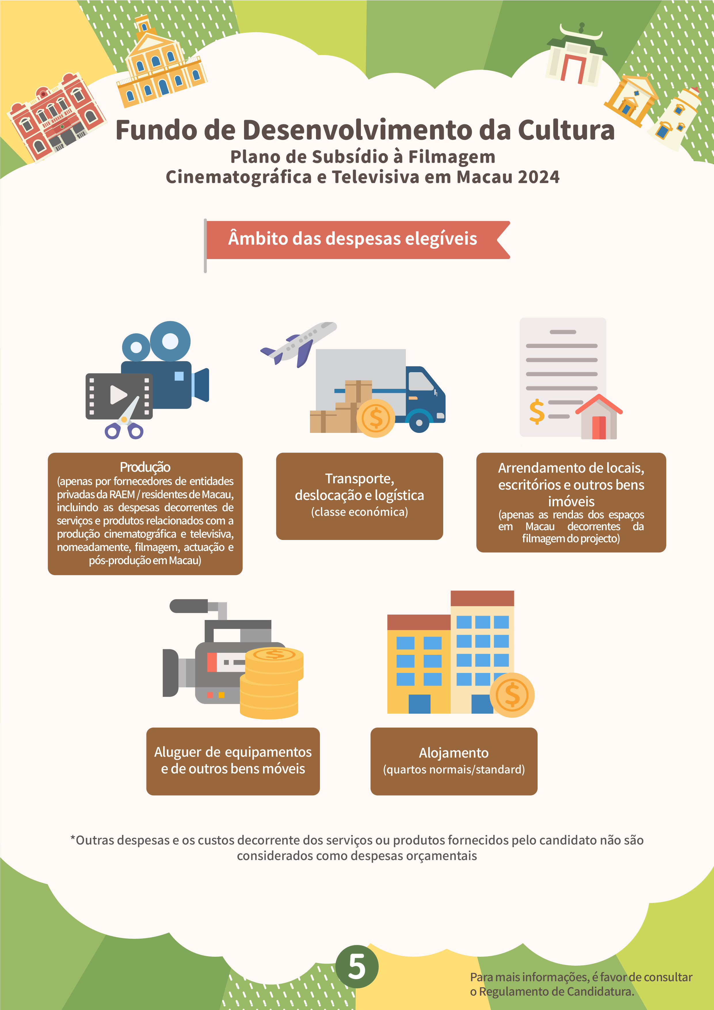 O “Plano de subsídio à filmagem cinematográfica e televisiva em Macau” tem por objectivo atrair equipas estrangeiras para a filmagem em Macau, e promover a imagem da cidade e melhorar a reputação internacional de Macau, através de produções cinematográficas e televisivas, proporcionando mais oportunidades para as empresas locais desta área a participarem nas filmagens de produções estrangeiras. Serão aceites projectos estrangeiros que ainda não tenham sido filmados em Macau antes do período de candidatura (6 de Fevereiro de 2024) e o tempo de filmagem em Macau não deverá ser inferior a três dias, sendo dirigidos por equipas de filmagem estrangeiras, as quais terão de vir a Macau para a respectiva filmagem. As candidaturas devem ser apresentadas pelos empresários comerciais locais que sejam unidades de produção em Macau, cujas actividades devem estar relacionadas com a produção cinematográfica e televisiva. Dentro do prazo de apoio financeiro, a exibição pública do projecto financiado deve estar concluída, tendo em conta que a duração do mesmo e dos locais de Macau que serviram de cenários do filme não podem ser inferiores ao limite de tempo especificado. O valor máximo a conceder é de 40% das despesas orçamentais para a realização da filmagem em Macau, até 2 milhões de patacas.