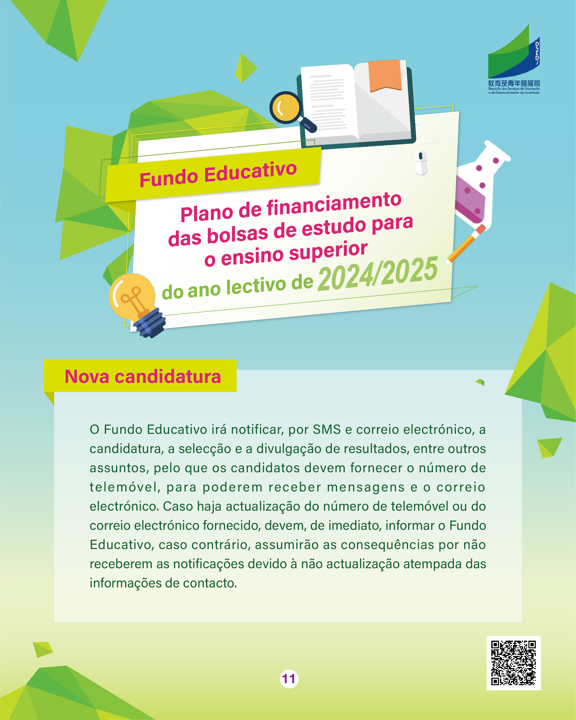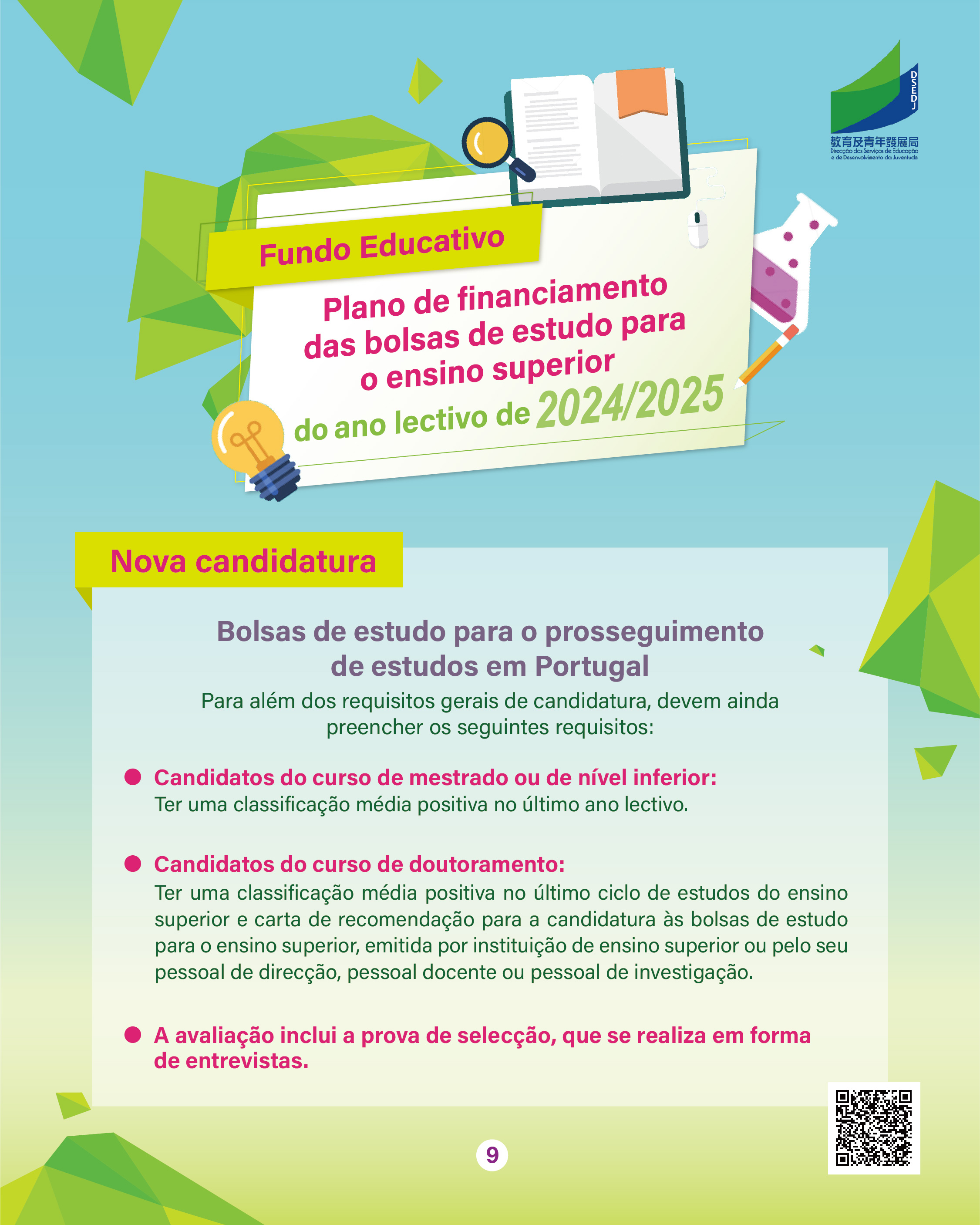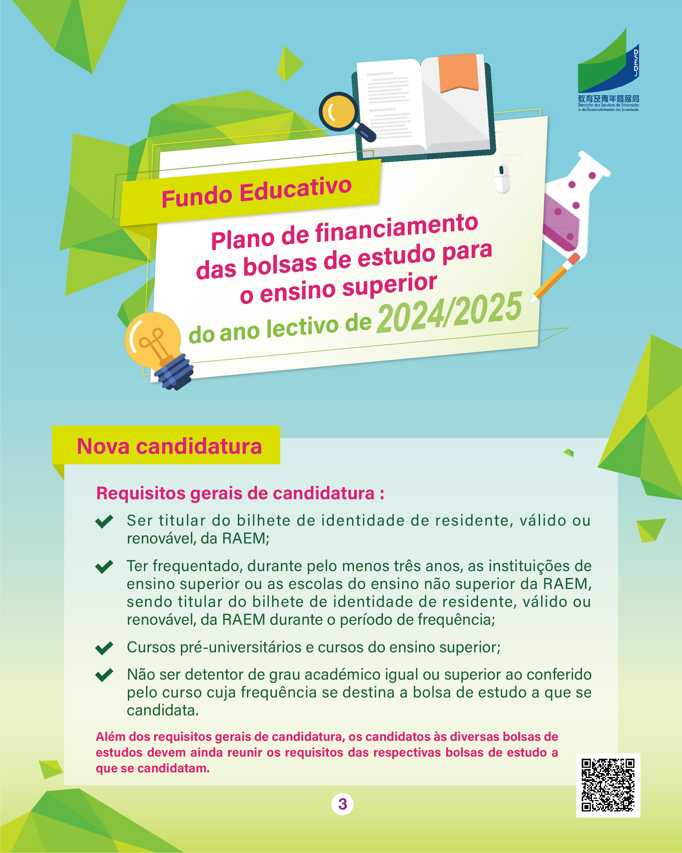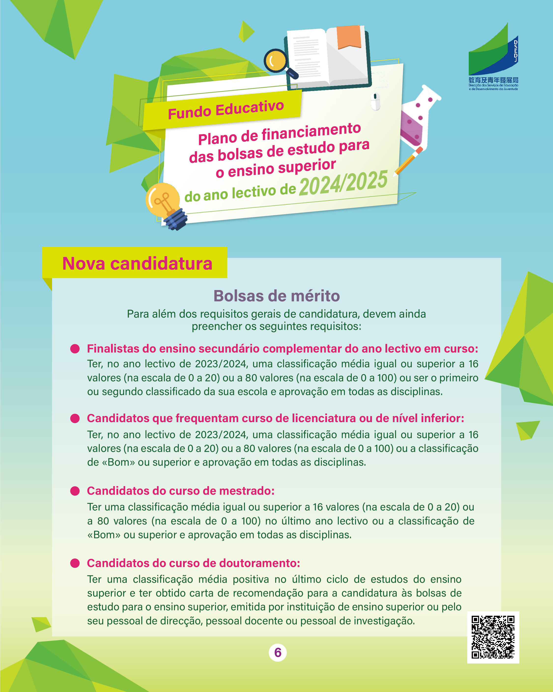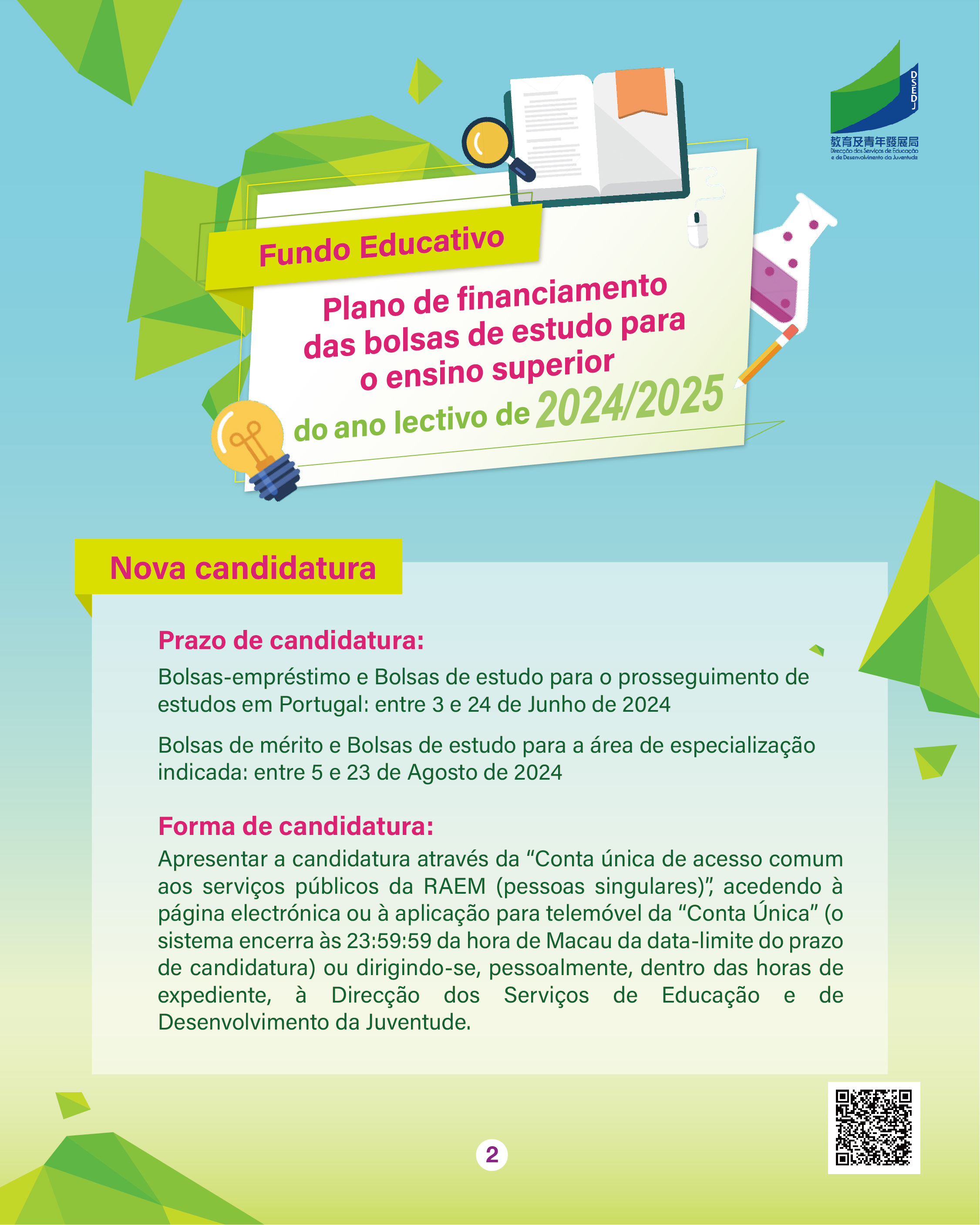 As candidaturas às bolsas-empréstimo e às bolsas de estudo para o prosseguimento de estudos em Portugal no ano lectivo de 2024/2025, no âmbito do “Plano de Financiamento das Bolsas de Estudo para o Ensino Superior” do Fundo Educativo (doravante designado por “Plano”), decorrem entre 3 e 24 de Junho de 2024. O prazo de candidatura às bolsas de mérito e às bolsas de estudo para a área de especialização indicada decorre de 5 a 23 de Agosto de 2024. Para que os alunos candidatos conheçam melhor as bolsas de estudo e as bolsas de mérito para o ensino superior criadas pelo Fundo Educativo, este vai realizar, no dia 16 de Março, na Escola Luso-Chinesa Técnico-Profissional, uma sessão de esclarecimento sobre o “Plano de Financiamento das Bolsas de Estudo para o Ensino Superior” do ano lectivo de 2024/2025, para a apresentação dos requisitos de candidatura, das formas de candidatura, das observações envolvidas às diversas bolsas de estudo e bolsas de mérito. Os alunos interessados podem inscrever-se nas escolas.