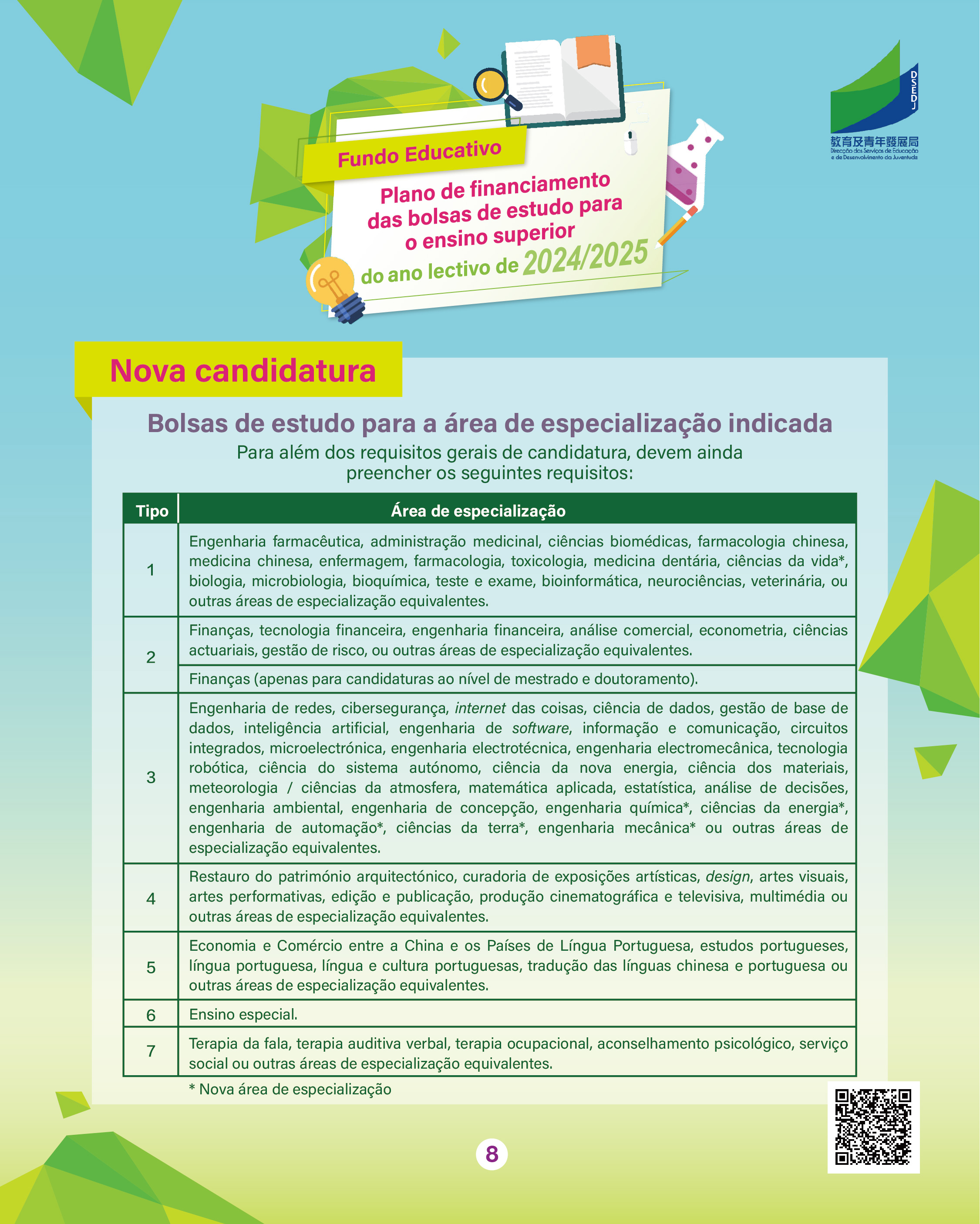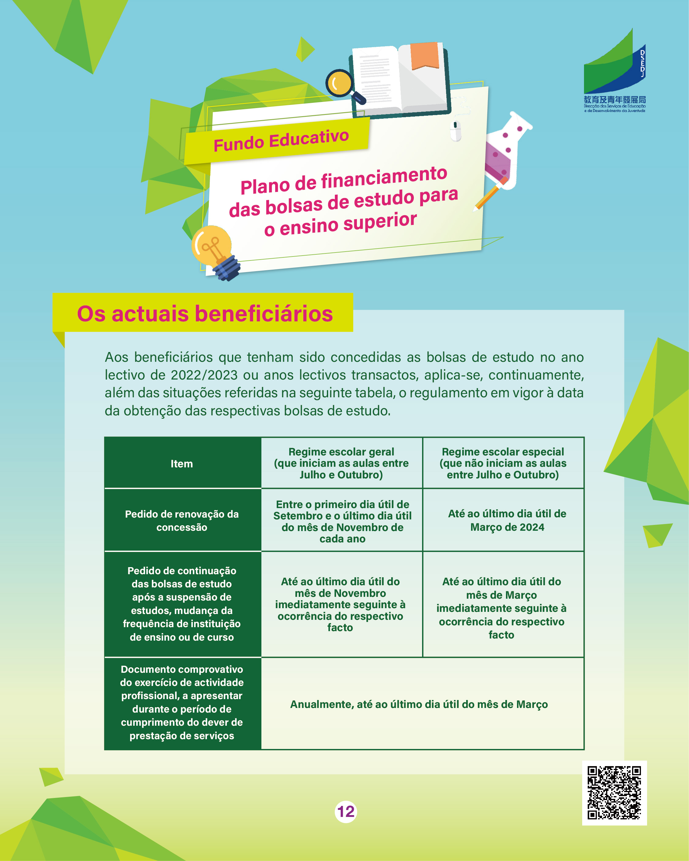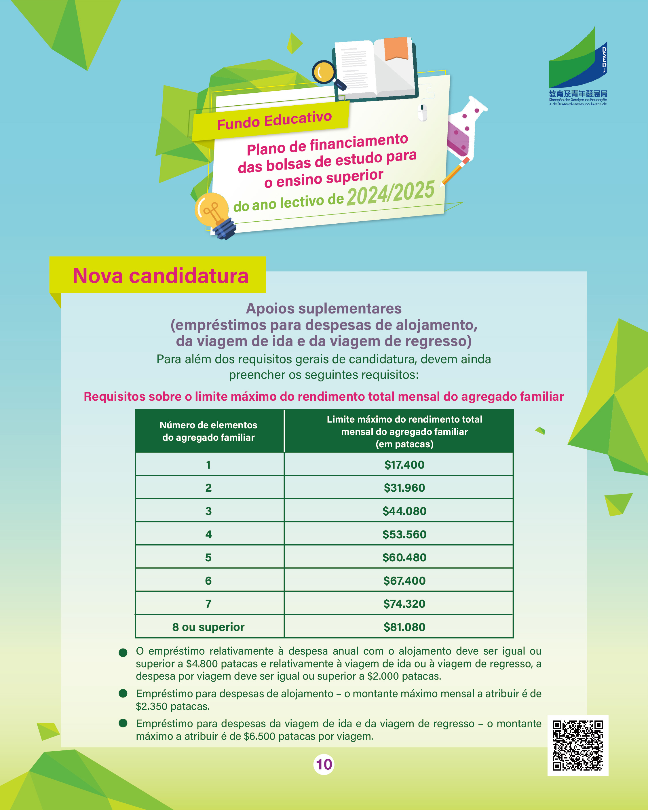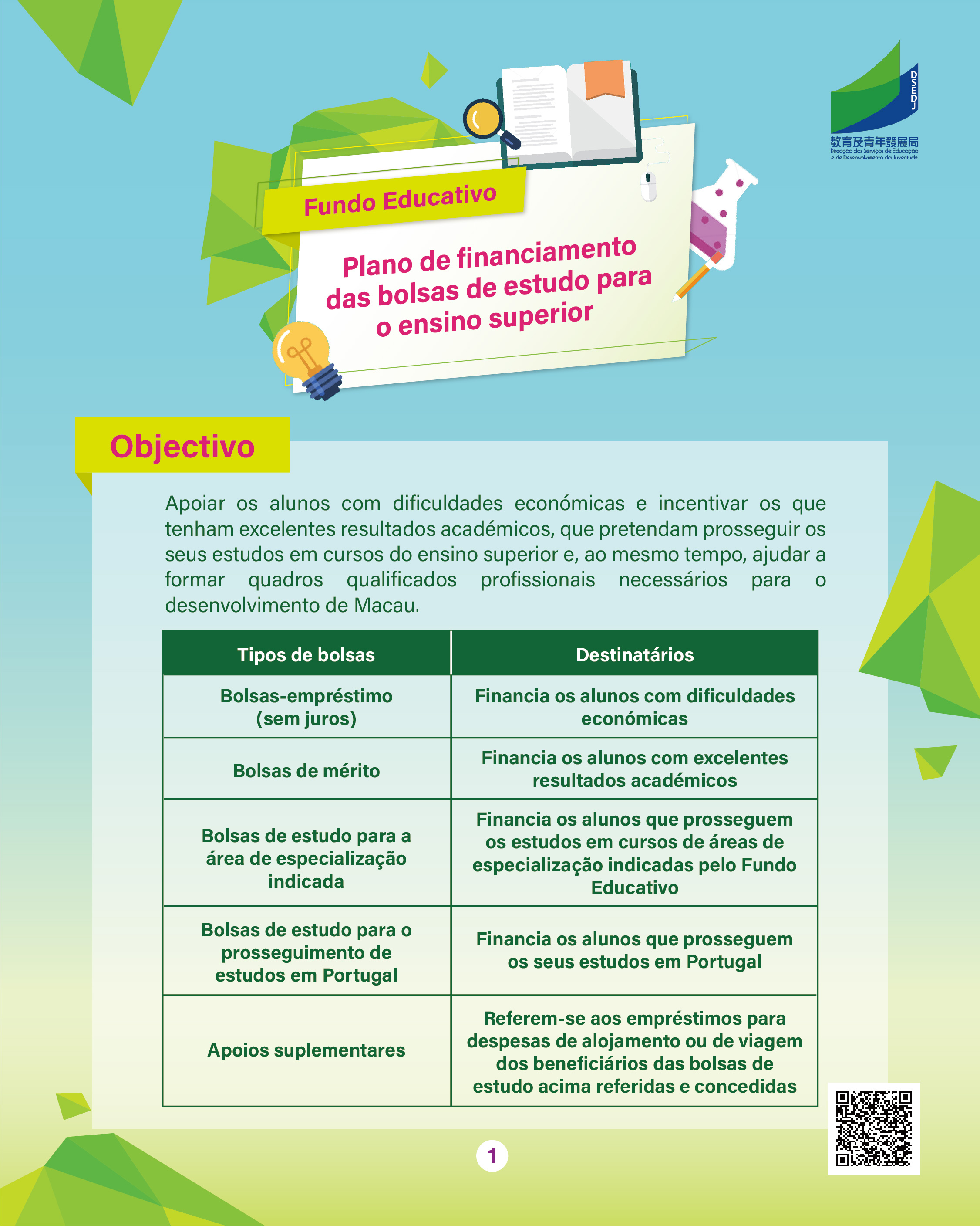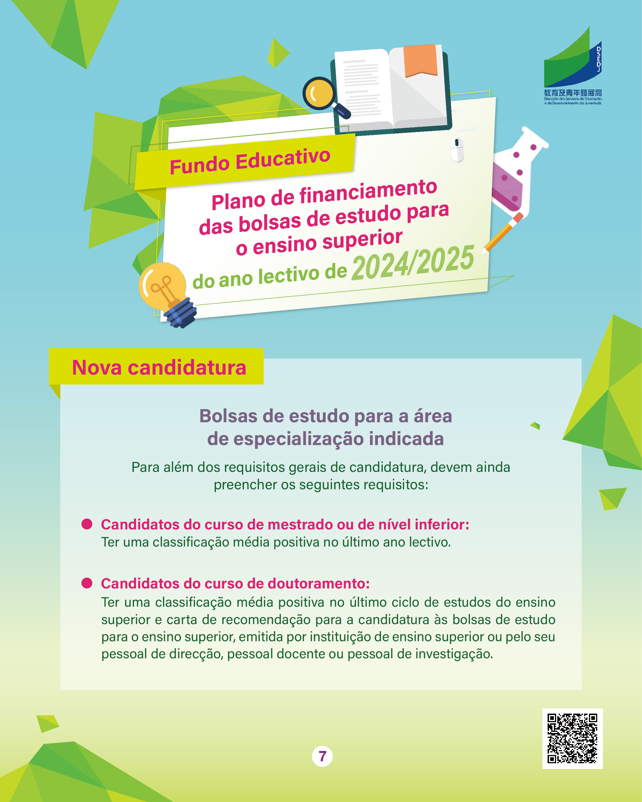 Para mais informações, podem consultar a página exclusiva do “Plano de Financiamento das Bolsas de Estudo para o Ensino Superior” (https://portal.dsedj.gov.mo/webdsejspace/internet/Inter_main_page.jsp?id=8744&langsel=P&).