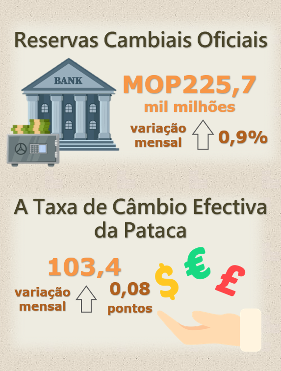 A Autoridade Monetária de Macau (AMCM), divulga hoje (dia 16) as estimativas preliminares das reservas cambiais da RAEM, que se cifraram em MOP225,7 mil milhões (USD28,03 mil milhões) no final de Janeiro de 2024, tendo aumentado 0,9% relativamente aos dados rectificados do mês anterior, que atingiram MOP223,6 mil milhões (USD27,77 mil milhões). No final de Janeiro de 2024, as reservas cambiais da RAEM registaram cerca de 11 vezes em relação à circulação monetária, ou 91,1% do agregado monetário M2 em MOP, no final de Dezembro de 2023.